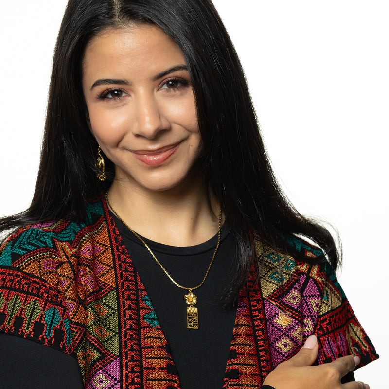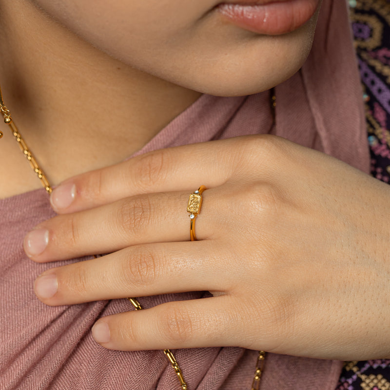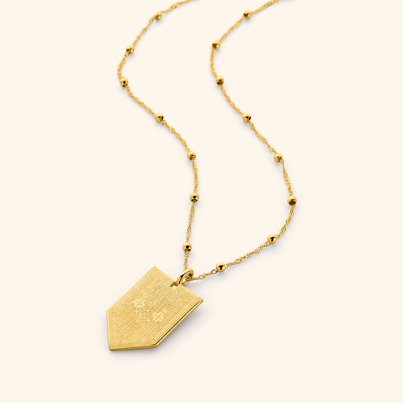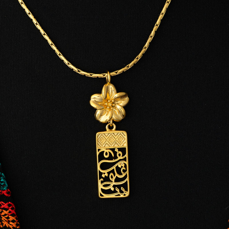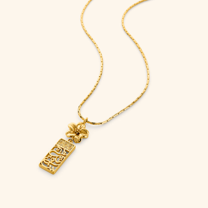 My Mother Tag Necklace - Nominal A close-up of the "My Mother Tag Necklace" in 18K gold plating, featuring a rectangular pendant engraved with the Arabic word "Ummi" ("my mother") in elegant calligraphy. The pendant hangs from a delicate dotted chain, showcasing its minimalist design.