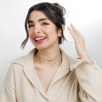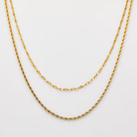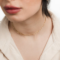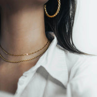 Close-up of a woman layering a gold rope chain choker with another delicate necklace, paired with a white shirt and large twisted gold hoop earrings.Gold rope chain necklace displayed against a neutral marble background.