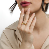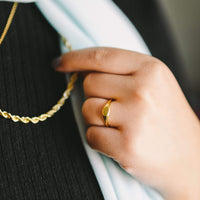 Close-up of a gold ripple ring worn on the index finger, with layered gold necklaces in the background.Gold ripple ring displayed on a light background.