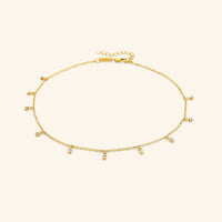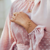Woman wearing a gold dotted hand chain, styled with a navy ribbed long-sleeve top, resting her hand near her chin.Flat lay of a  gold dotted hand chain with a slim bracelet attached to a matching finger loop by a fine chain.