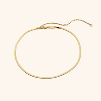 Model wearing two gold herringbone chains over a white ribbed turtleneck, holding one chain with her left hand.Two gold herringbone chains laid flat against a cream background.