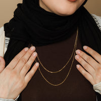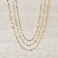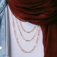 Gold link chain necklaces layered over a white top, styled with a maroon scarf and light denim jacket.Three gold link chain necklaces of varying thicknesses and lengths displayed against a light beige background.