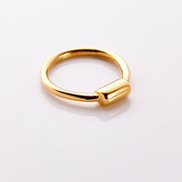 Close-up of a woman’s hand near her ear, wearing a gold band ring.Gold band ring displayed on a soft cream background.