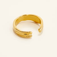 Hand wearing a gold "Love Yourself First" ring on ring finger.Close-up of a gold ring shaped into Arabic calligraphy spelling "Love Yourself First," on a neutral background.