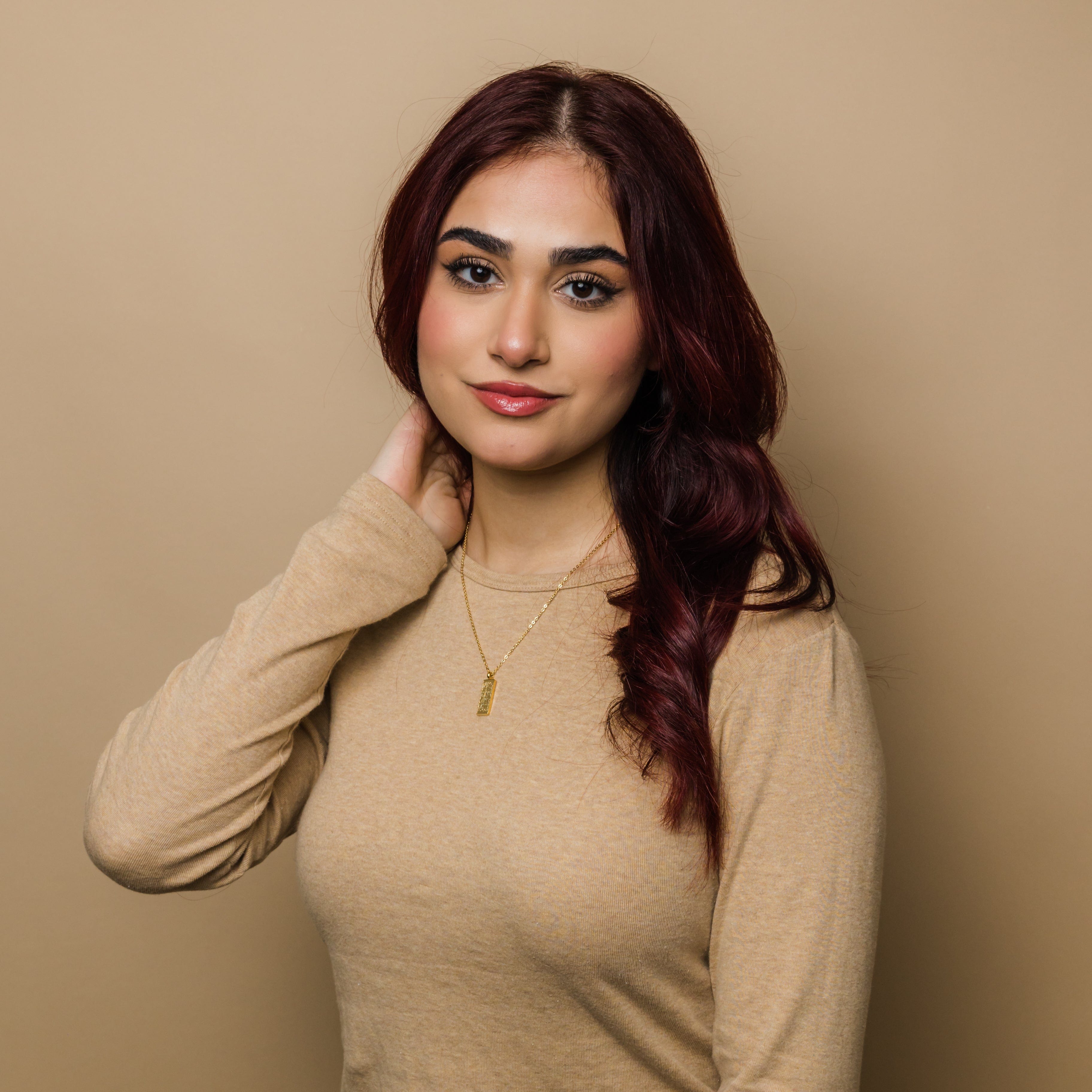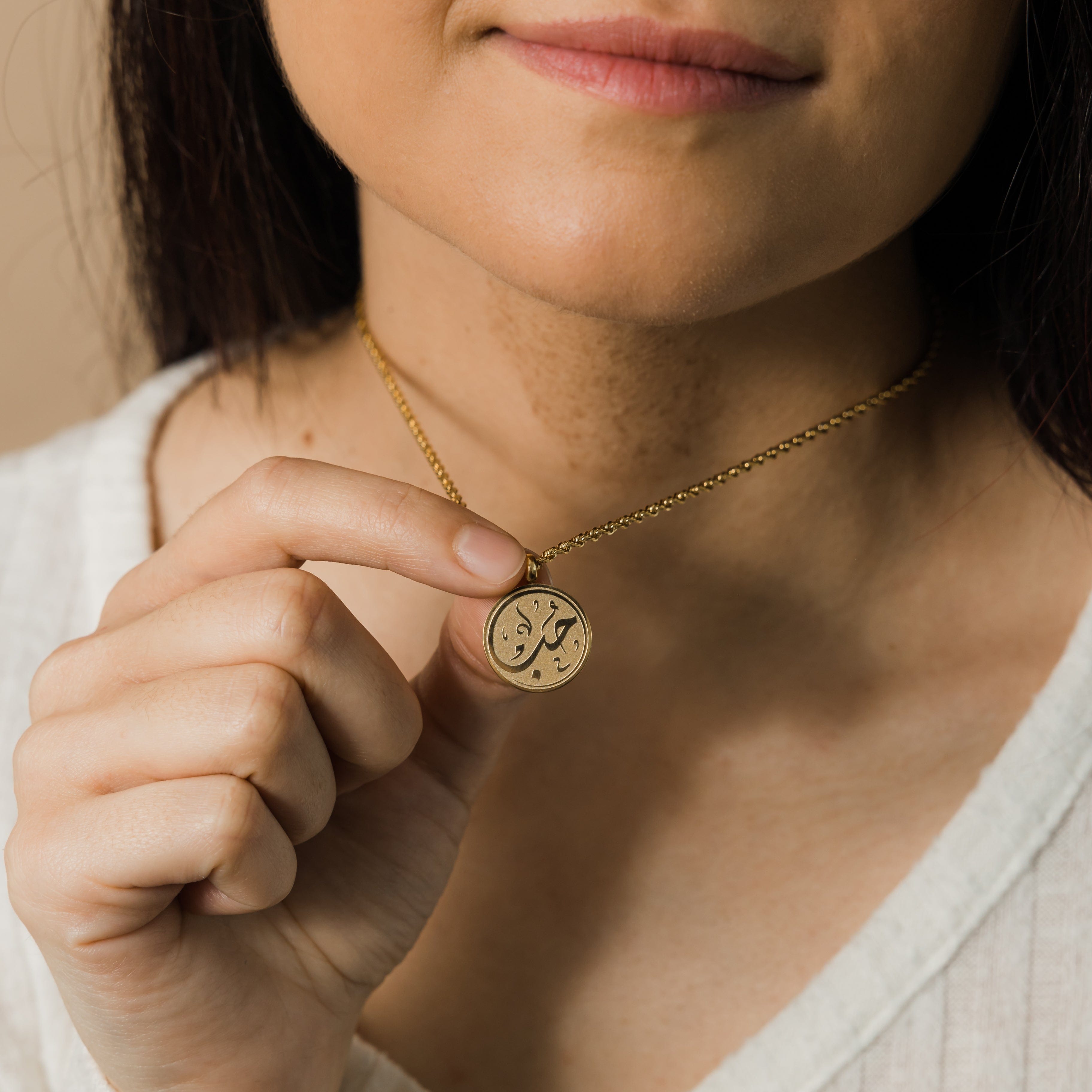A model wearing the 18K gold-plated "Water Your Dreams" Necklace. The pendant rests gracefully on her collarbone, highlighting the intricate Arabic calligraphy and olive leaf design against her skin."Water your Dreams" Necklace - Nominal