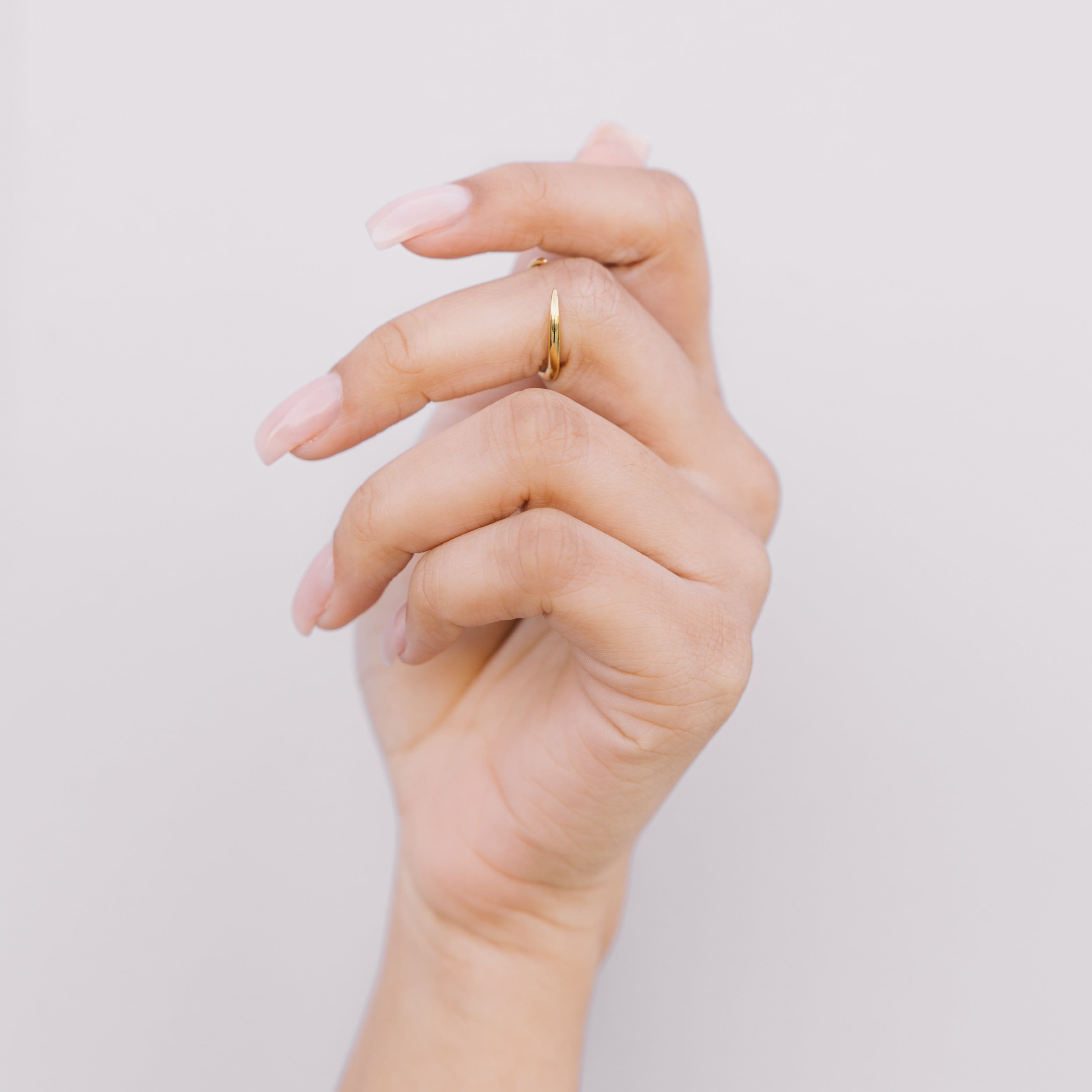 Close-up of a woman’s hand near her ear, wearing a gold band ring.Gold band ring displayed on a soft cream background.