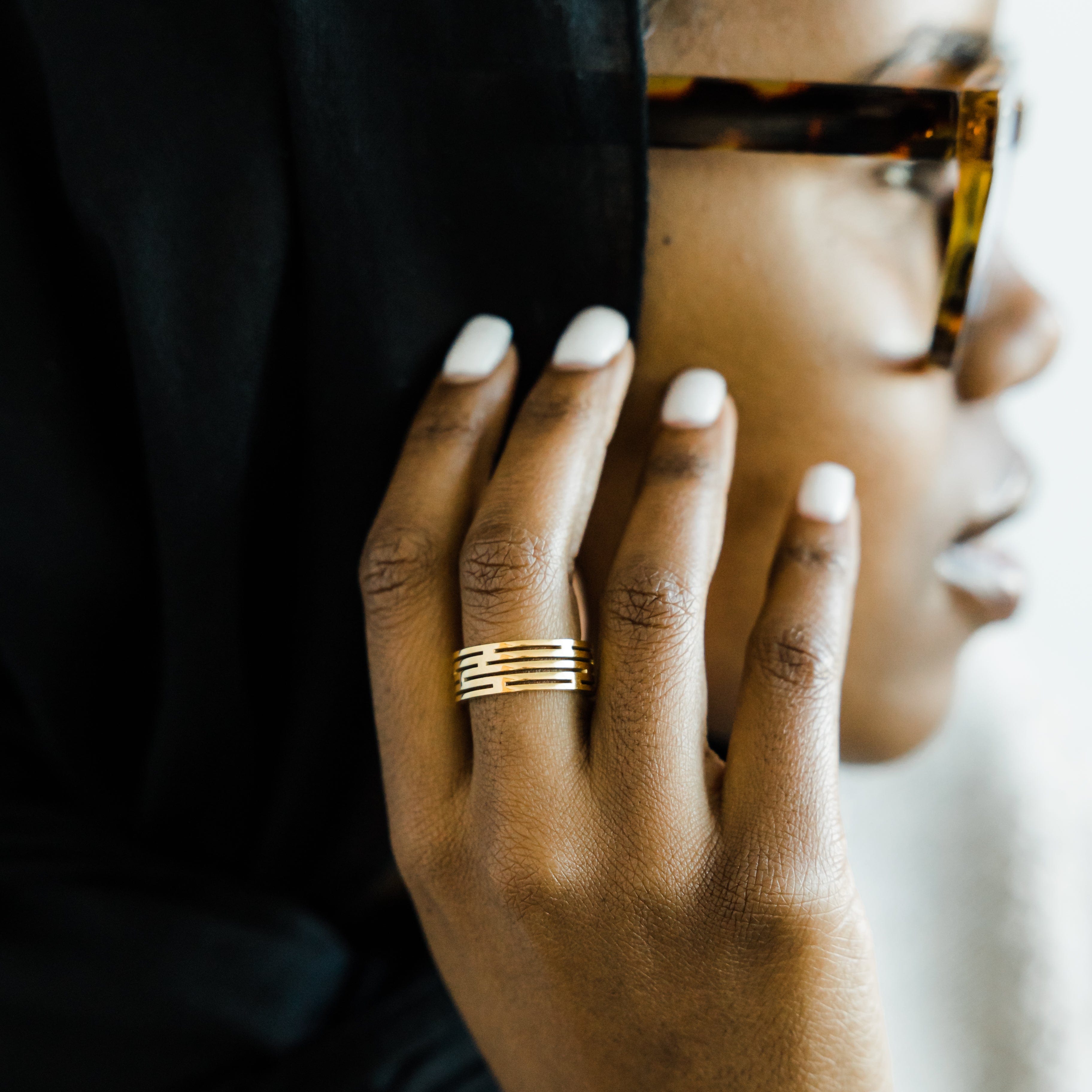 Close-up of a gold ripple ring worn on the index finger, with layered gold necklaces in the background.Gold ripple ring displayed on a light background.