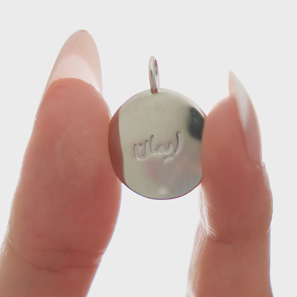 إيمان — faith close to the heart. This charm is engraved with إيمان in Arabic on one side and Faith on the other. A quiet reminder to trust deeply, stand firm, and carry belief with you through every hardship of life. Slide it onto your chain and layer it with the words that hold you steady.