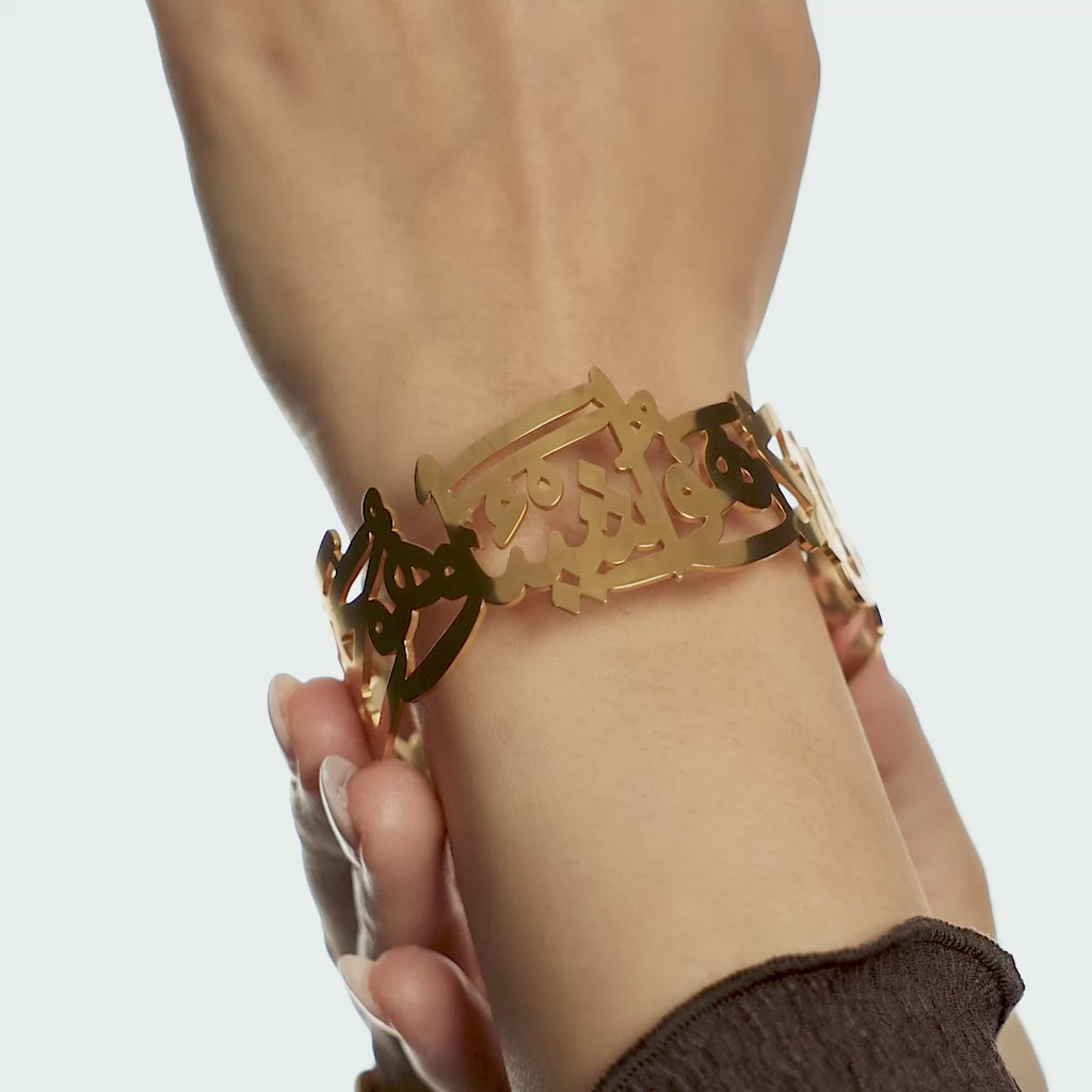 Carved entirely from open Arabic script, this cuff forms the comforting verse “Perhaps you dislike something which is good for you.” (Qur’an 2:216).