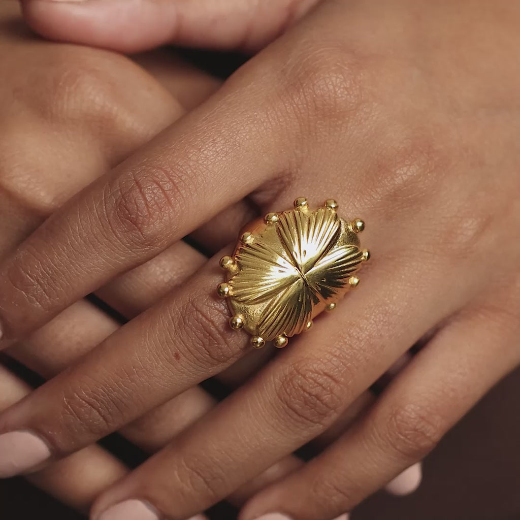 The Regal Garden Ring takes its form from the gardens we grew up around where sunlight met petals, and clusters of blossoms marked every corner. Its oval shape is framed with rounded orbs, echoing the richness of South Asian design while staying timeless enough for everyday wear. A reminder of home, sunshine in your hands.