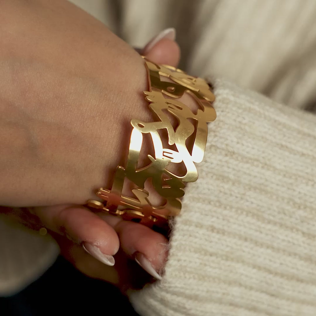 Carved entirely from flowing Arabic calligraphy, this open‐work cuff spells a message every heart needs: "ما يميّزك يجمّلك" — What makes you different makes you beautiful.