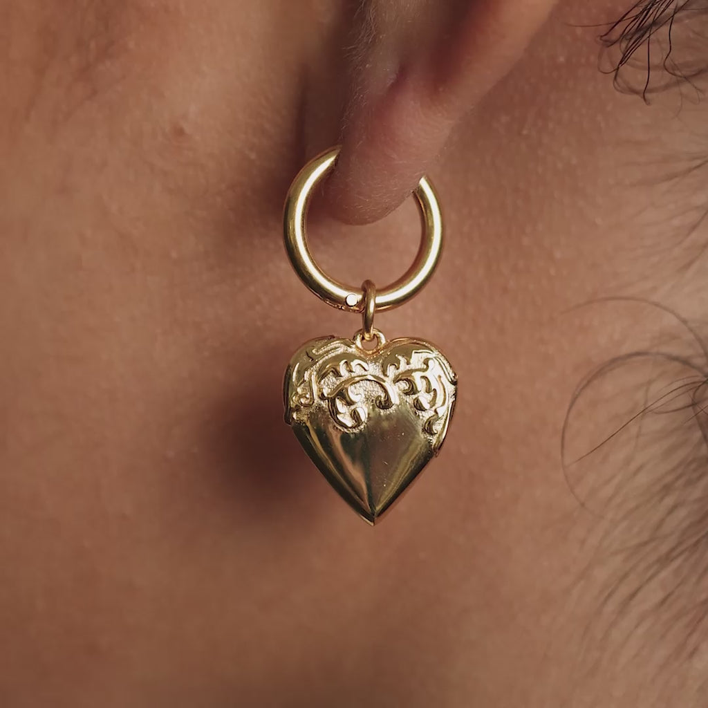 Mini hoops meet heirloom romance. These heart-shaped pendants are finished with delicate, vine-like engravings reminiscent of plants melting down courtyard walls or the edges of antique mirrors from back home. A soft nod to love, nostalgia, and all things tender.