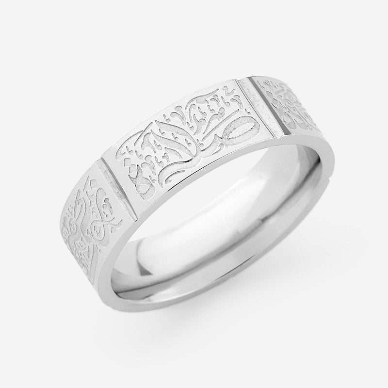 The five pillars of Islam are the shahada, prayer, zakat, fasting, and hajj. Each one is engraved along this entire band in Arabic, marked with a ridged separation between each pillar. This ring represents all of the core pillars that make us Muslims and is meant to make you proud of the actions you embody in your everyday life. Be proud of who you are.