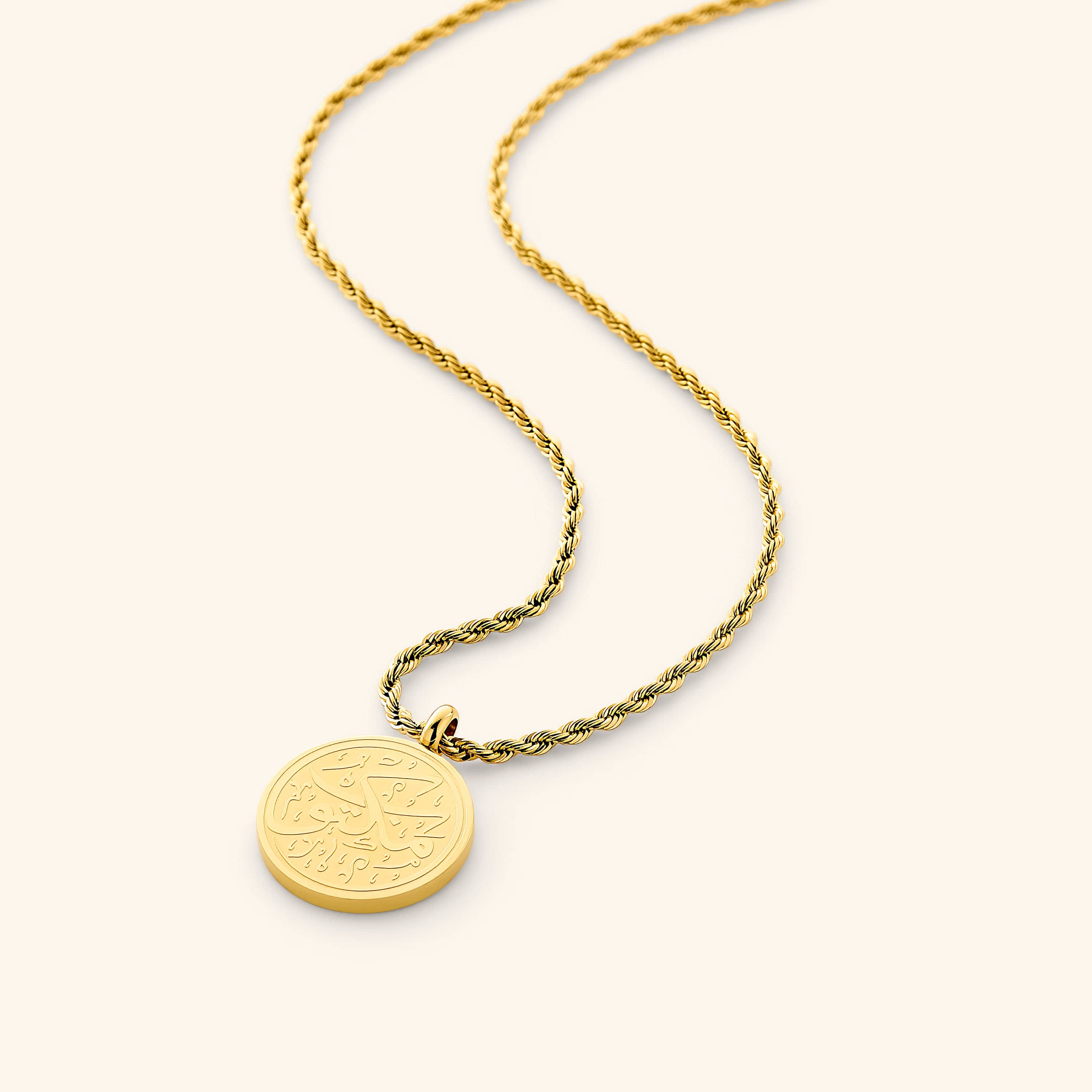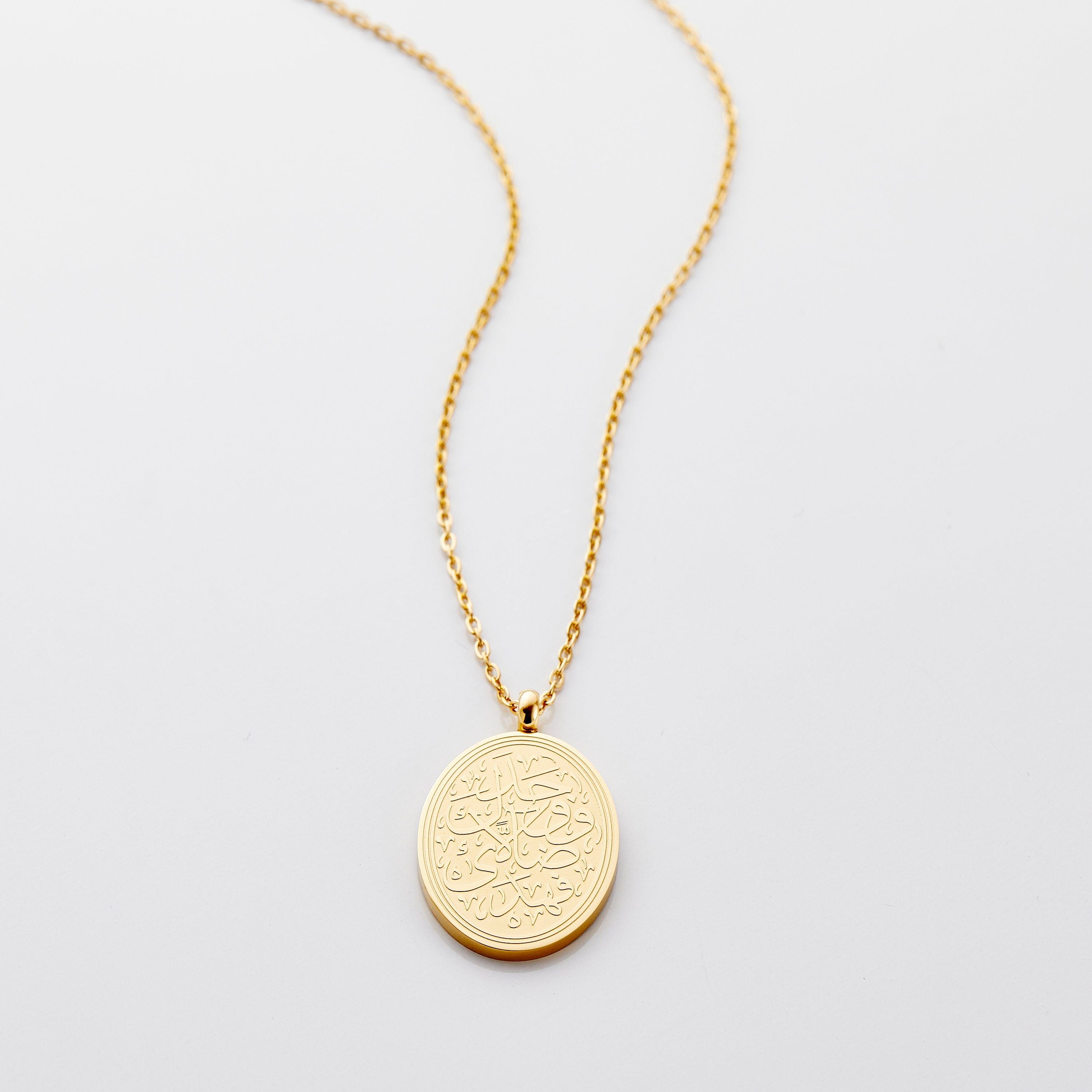 Hand holding the gold Duaa Al-Safar pendant up, the Arabic calligraphy details visible on the medallion.Gold circular pendant engraved with Arabic Duaa Al-Safar calligraphy on a fine chain, laid flat with toggle clasp visible against neutral background.