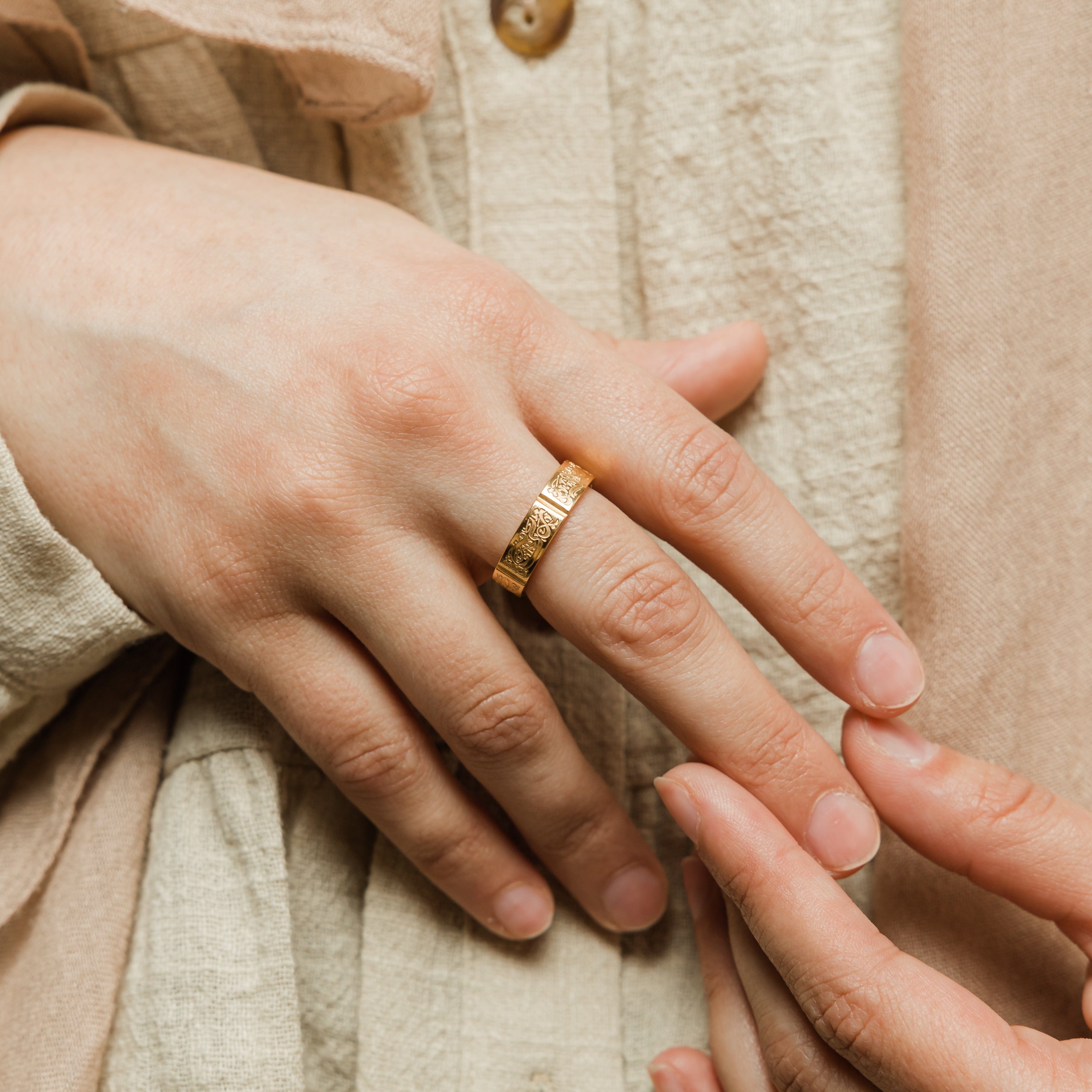 Gold thikr wrap ring with engraved Arabic calligraphy styled on a woman’s handClose-up of a gold thikr wrap ring engraved with Arabic calligraphy wrapping around the band, photographed on a neutral background.