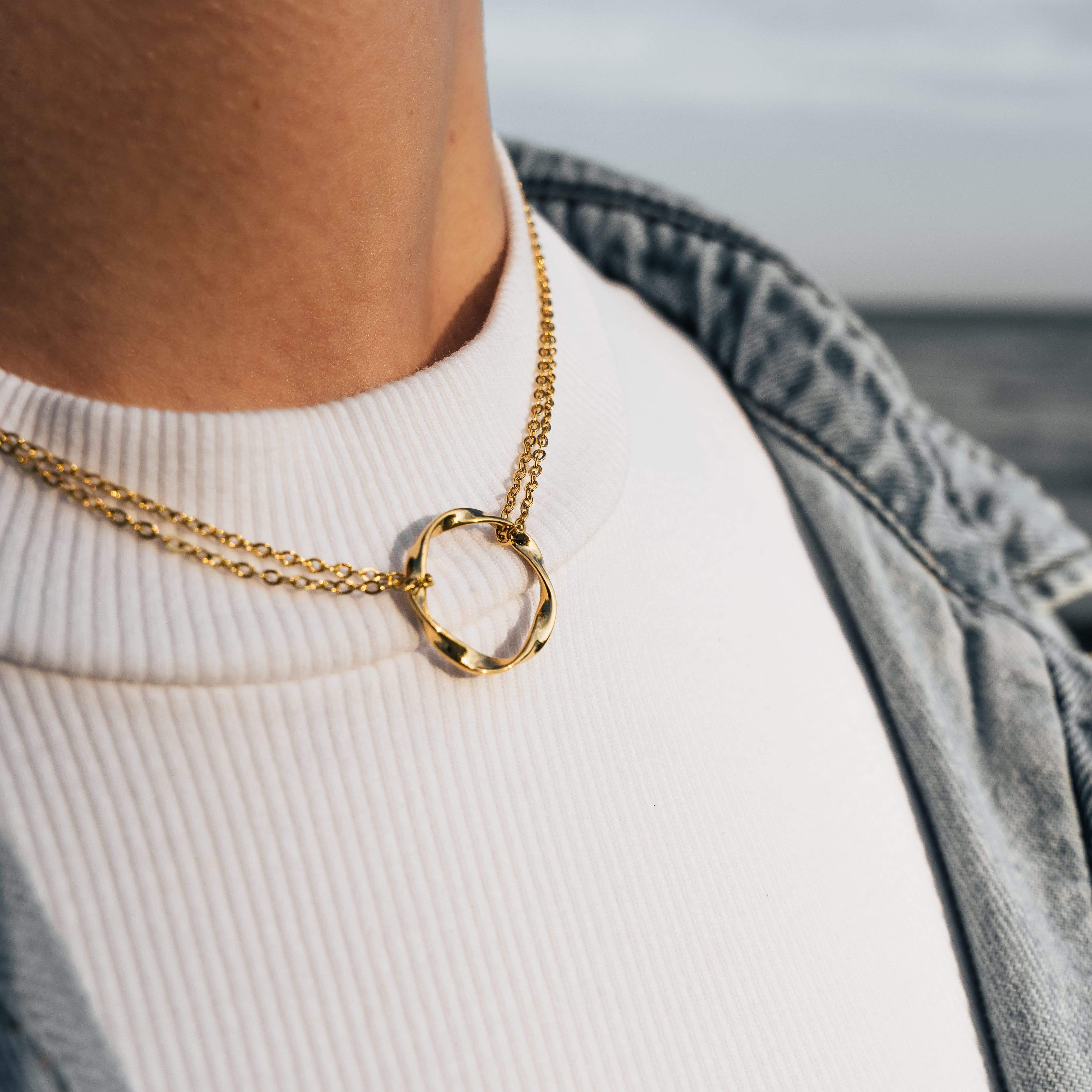 Close-up of a gold ripple ring worn on the index finger, with layered gold necklaces in the background.Gold ripple ring displayed on a light background.