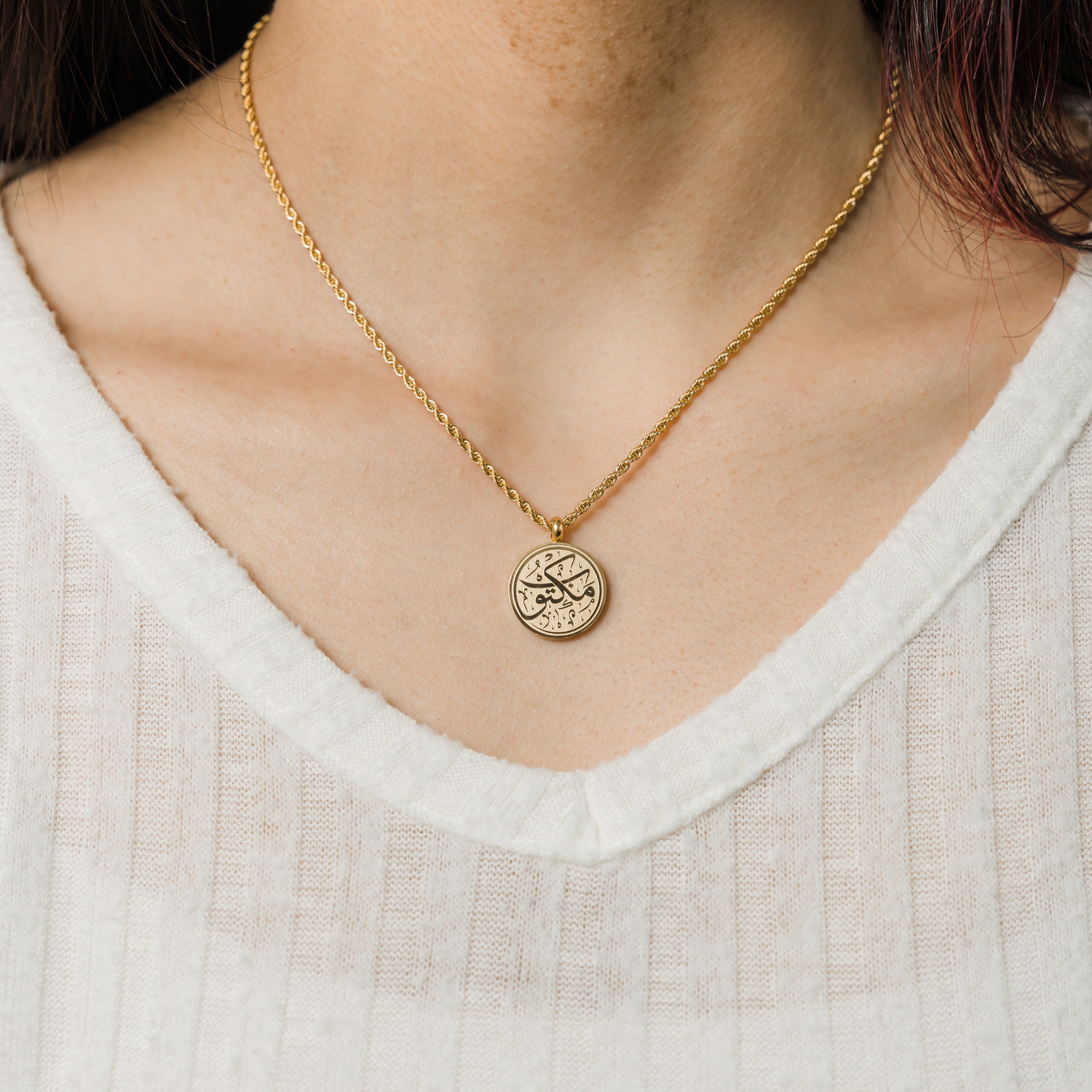 Close-up of a model wearing one of the interlocked necklaces, with the circular pendant resting on her collarbone, highlighting the Arabic inscription.Two gold-plated interlocked necklaces shown side by side on a white background. Each features a circular pendant inscribed in Arabic, symbolizing the phrase "Hold on to each other."