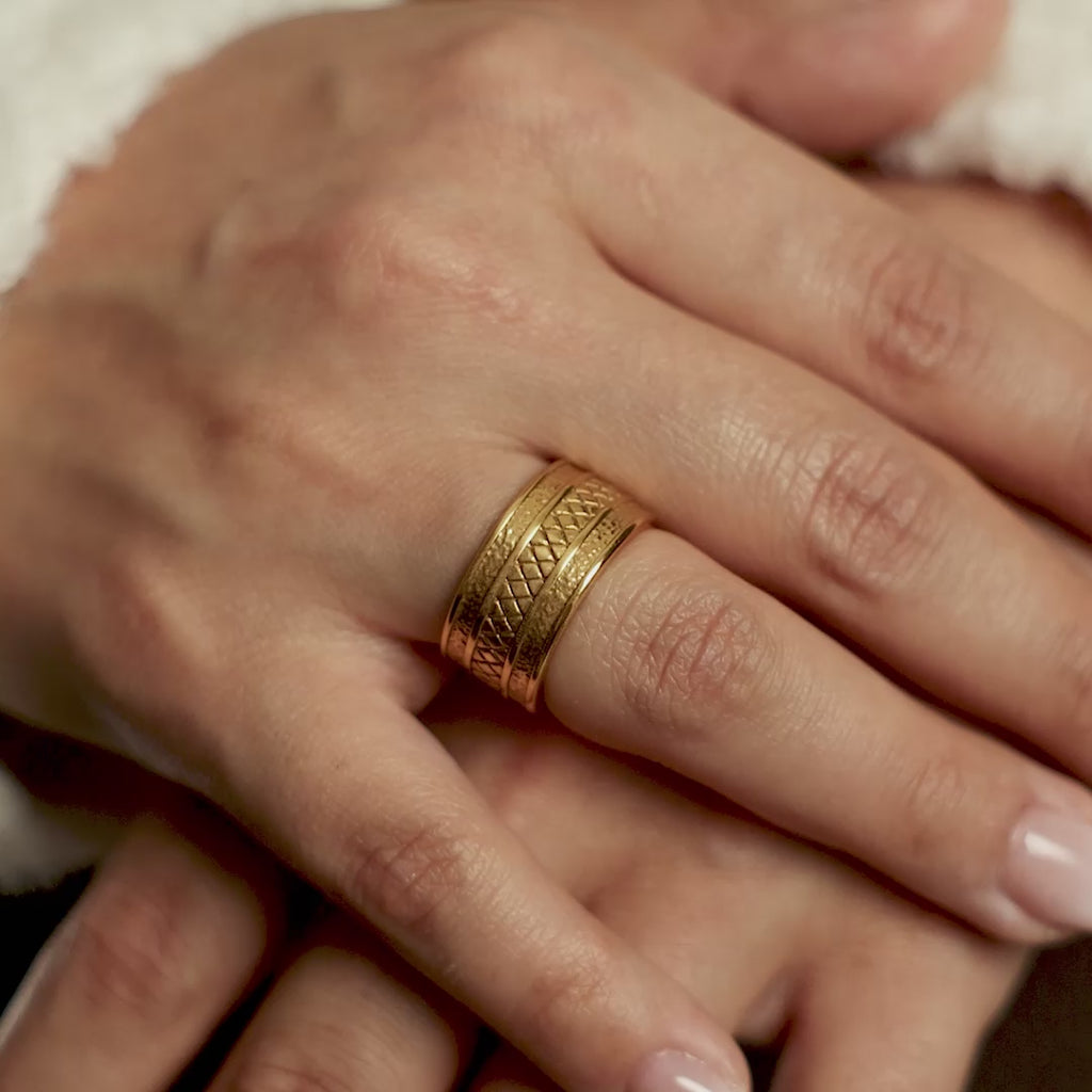 Inspired by traditional dhahab (gold) from Palestine, this ring carries the texture and geometry that so many of us grew up seeing on our mothers and grandmothers. It’s simple, classic, and unmistakably Palestinian. This is how we keep home close.