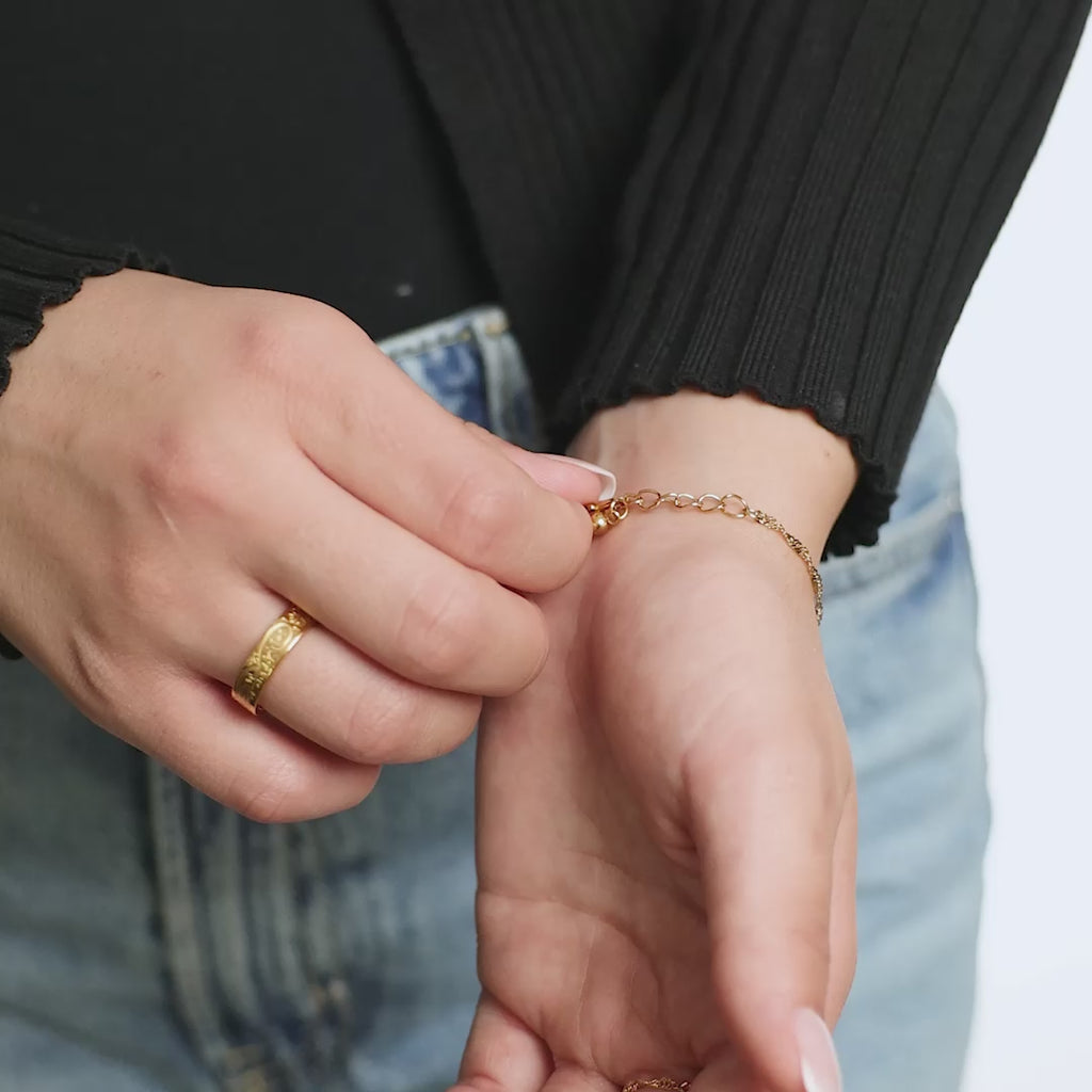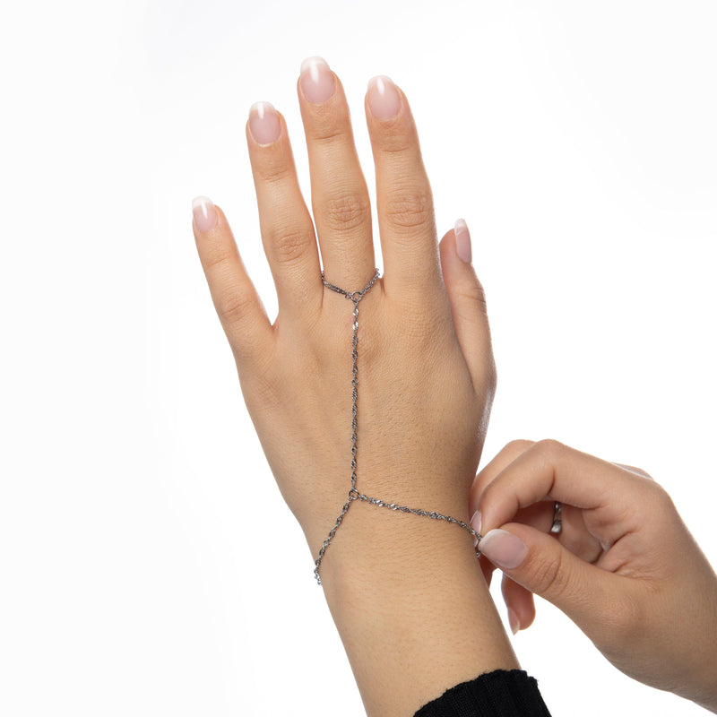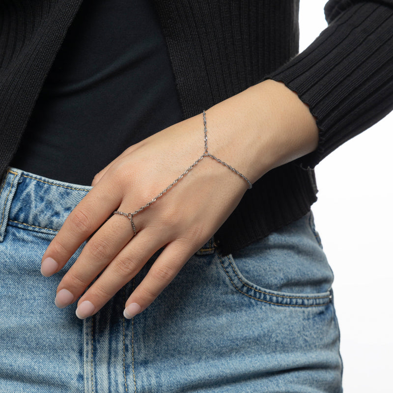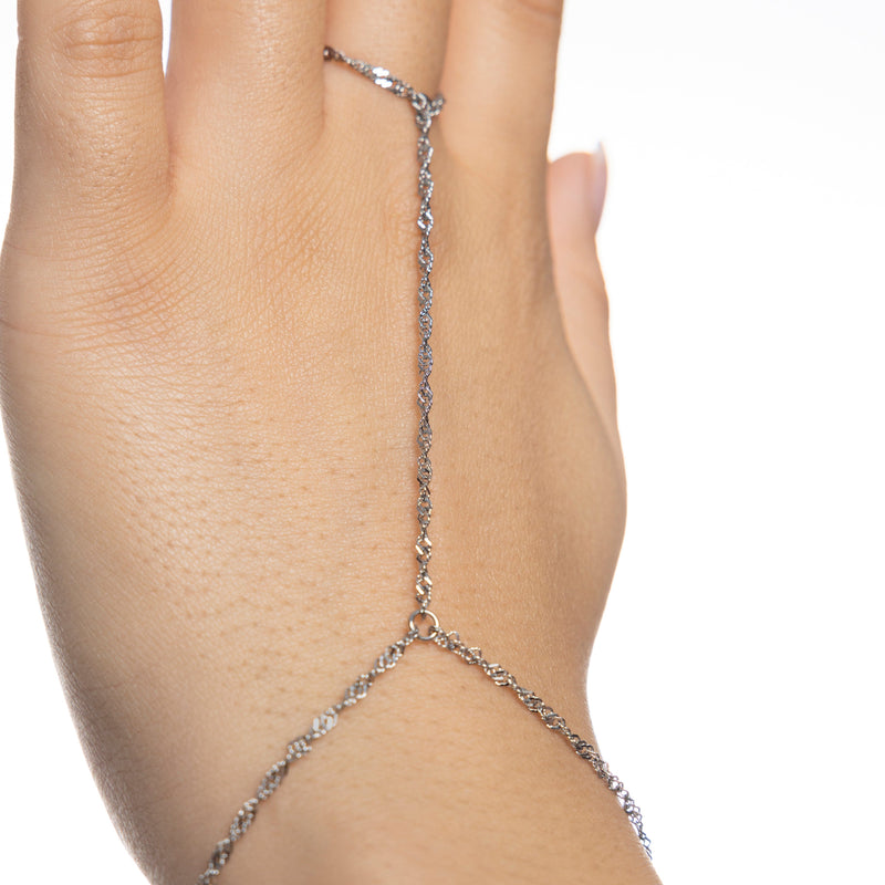 Delicate but striking, this hand chain features our signature twisted chain, wrapping the wrist and connecting to the finger in one seamless flow. The twisted hand chain is elegance that speaks without saying a word.