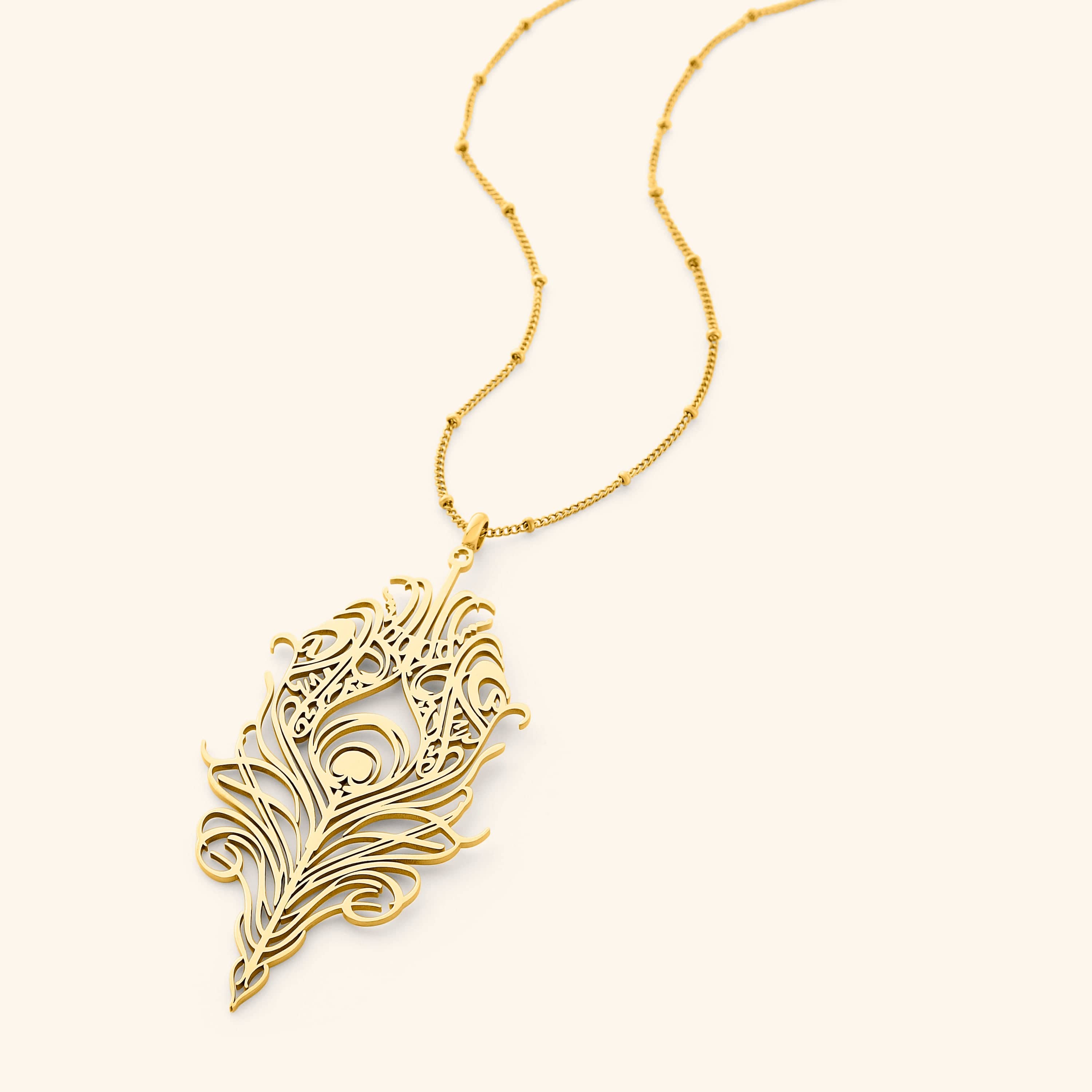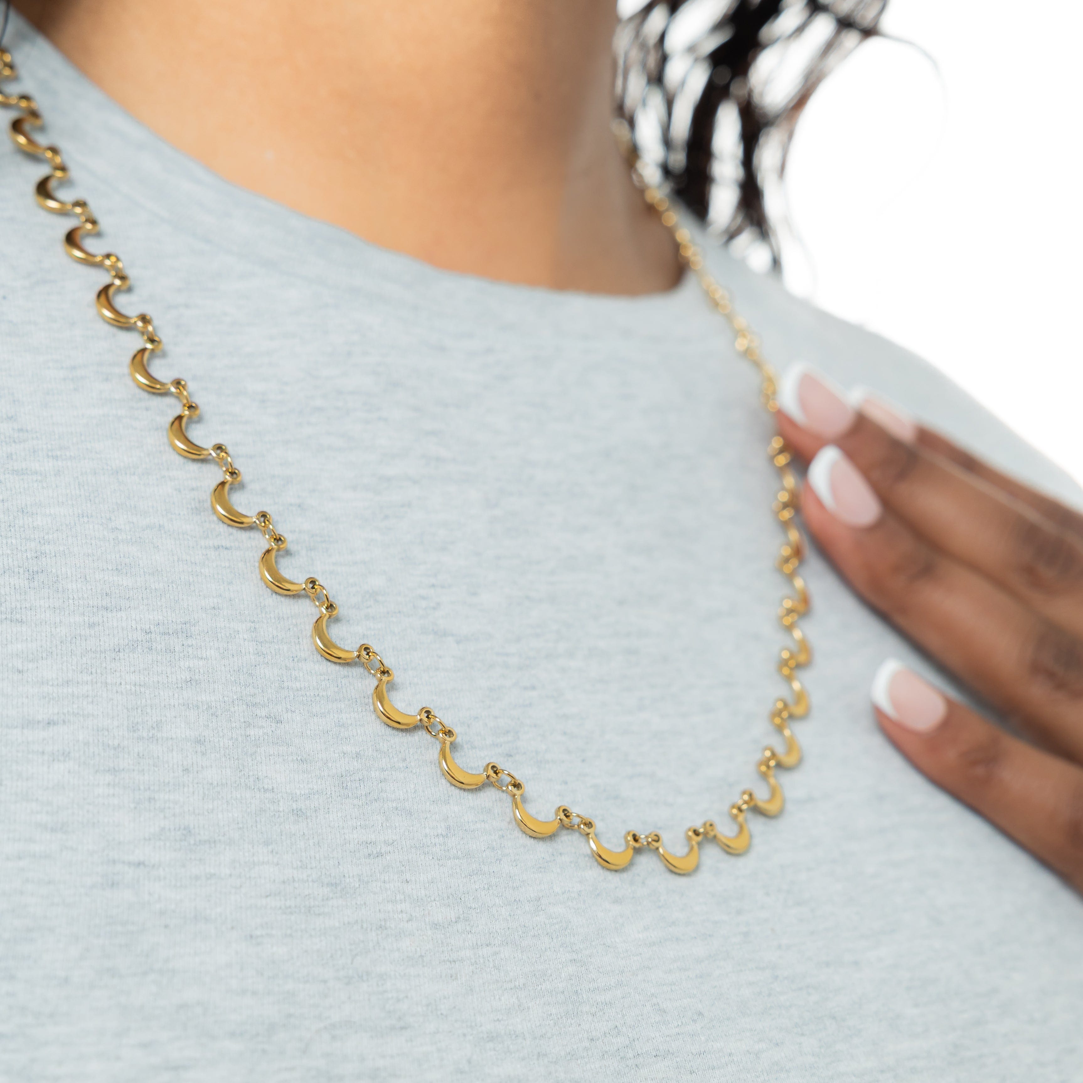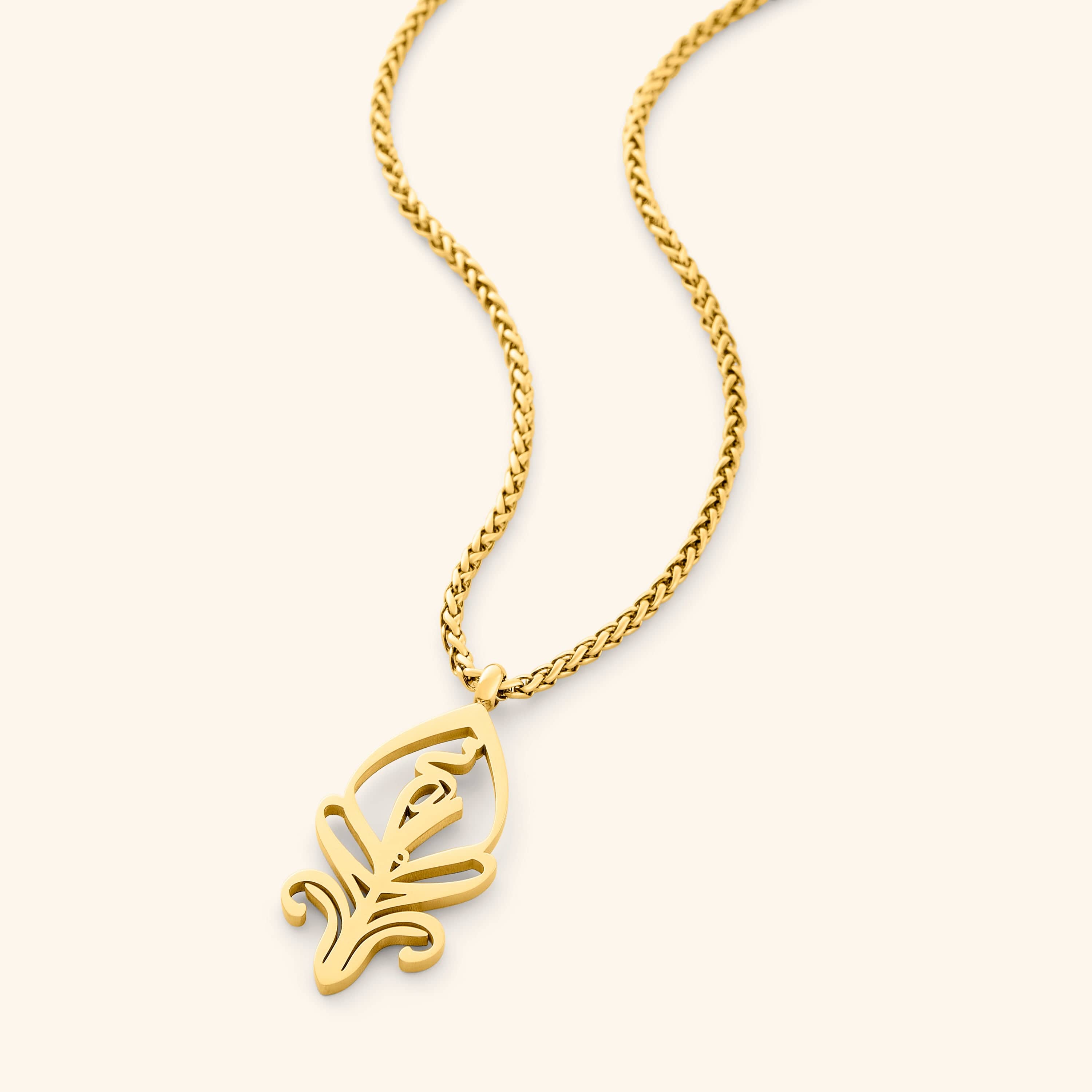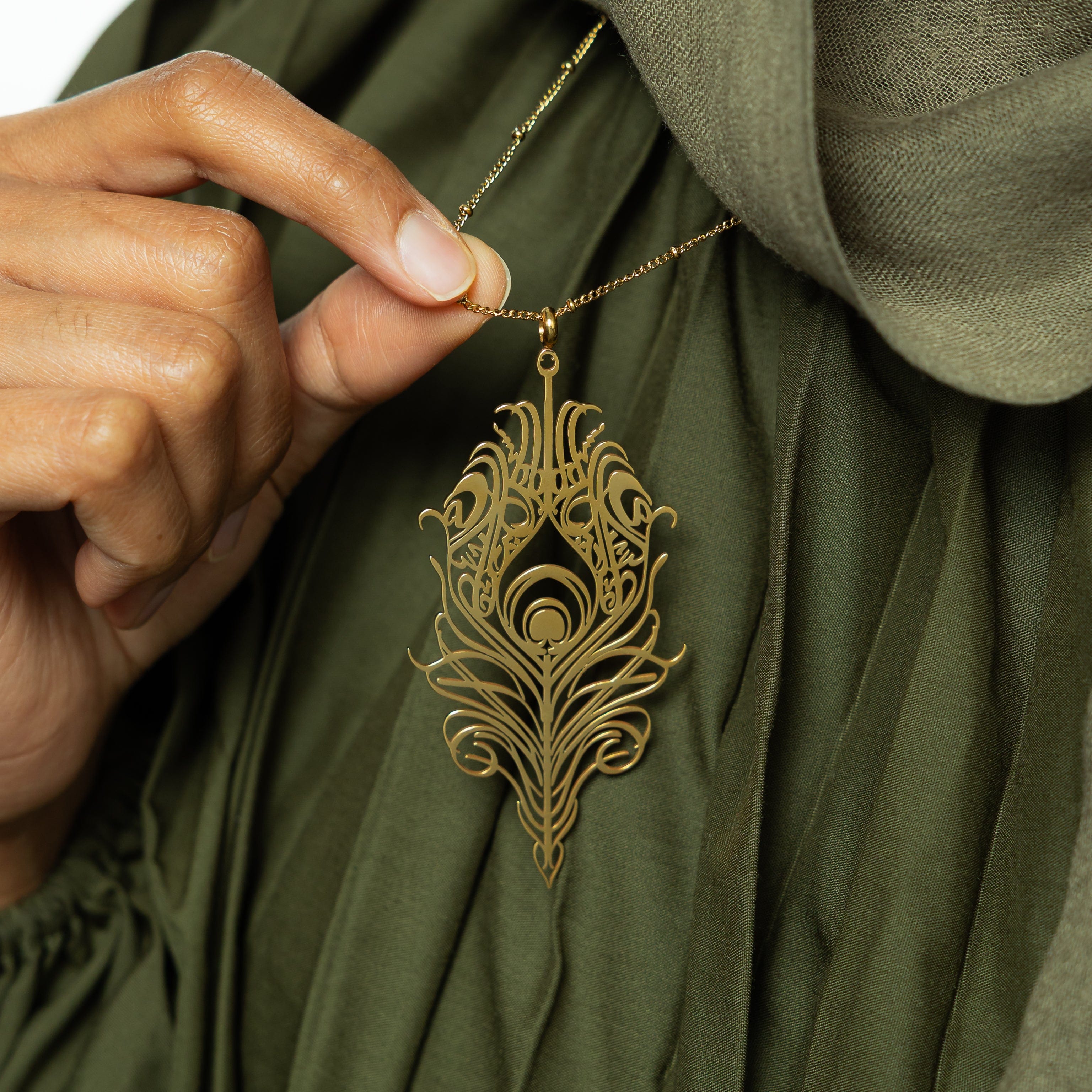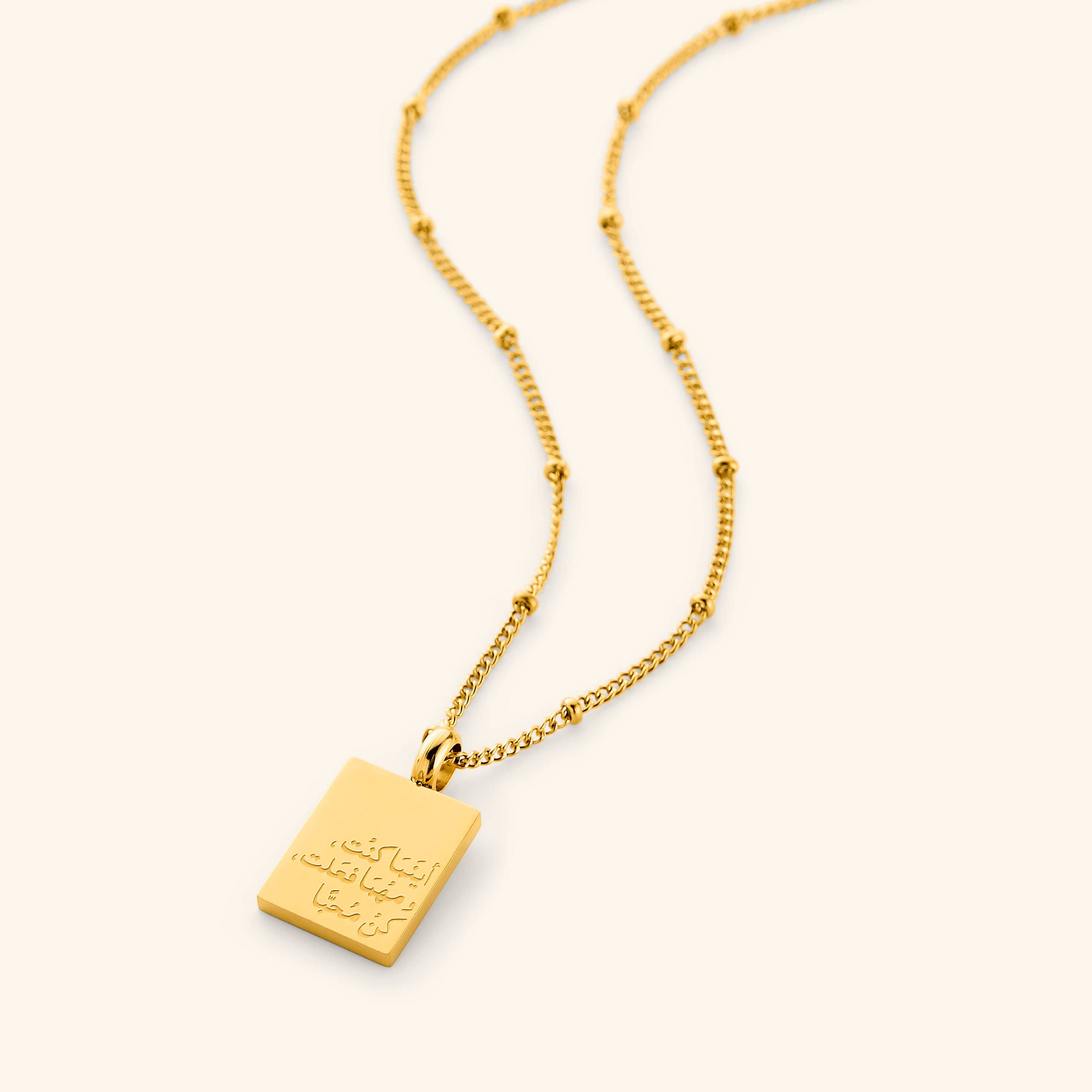 Gold necklace with a round pendant featuring the engraved phrase 'What you seek is seeking you' in Arabic calligraphy. The design includes a raised crescent moon and a flowing motif, framed with vine detailing and three small bead accents around the border. Gold necklace with a round pendant featuring the engraved phrase 'What you seek is seeking you' in Arabic calligraphy. The design includes a raised crescent moon and a flowing motif, framed with vine detailing and three small bead accents around the border.