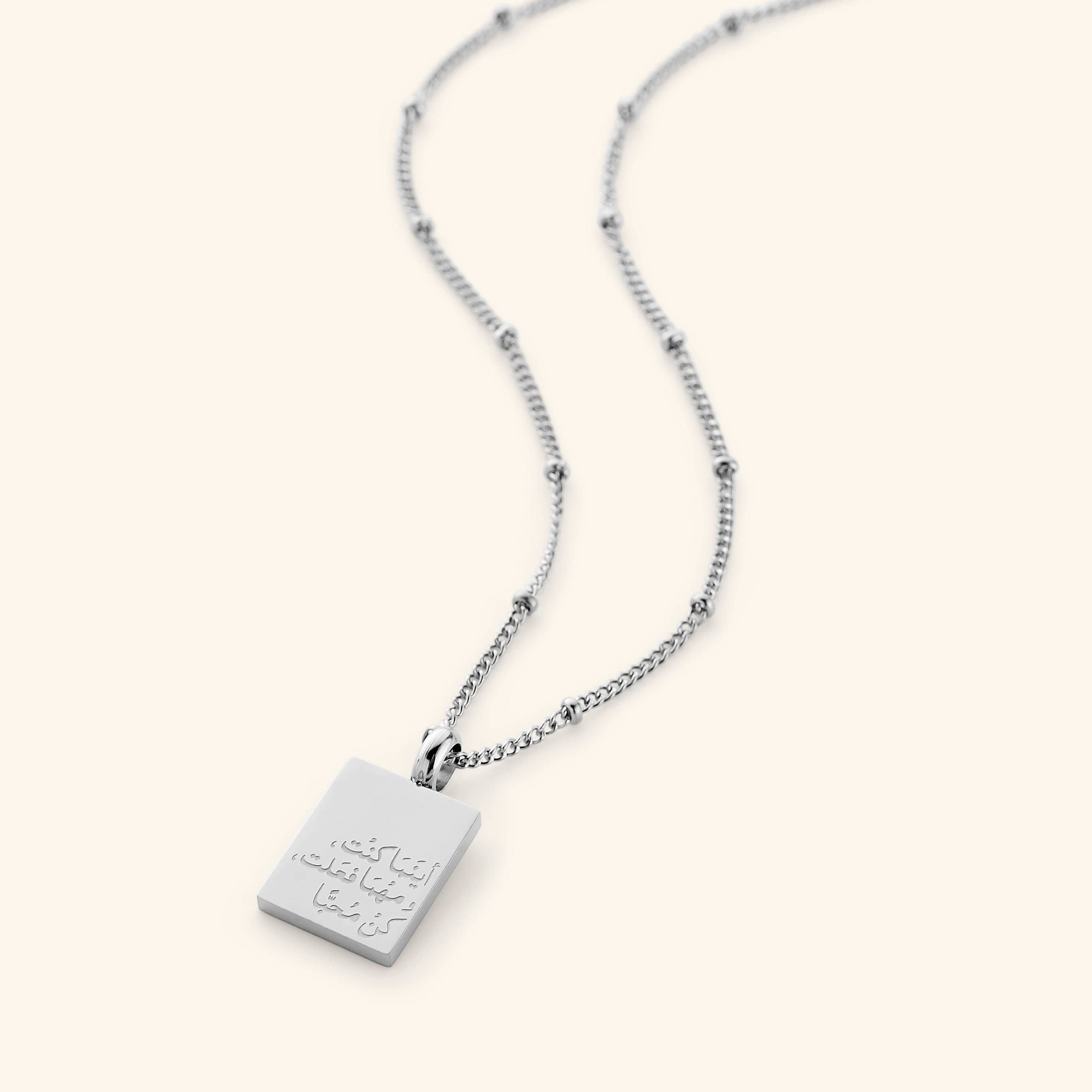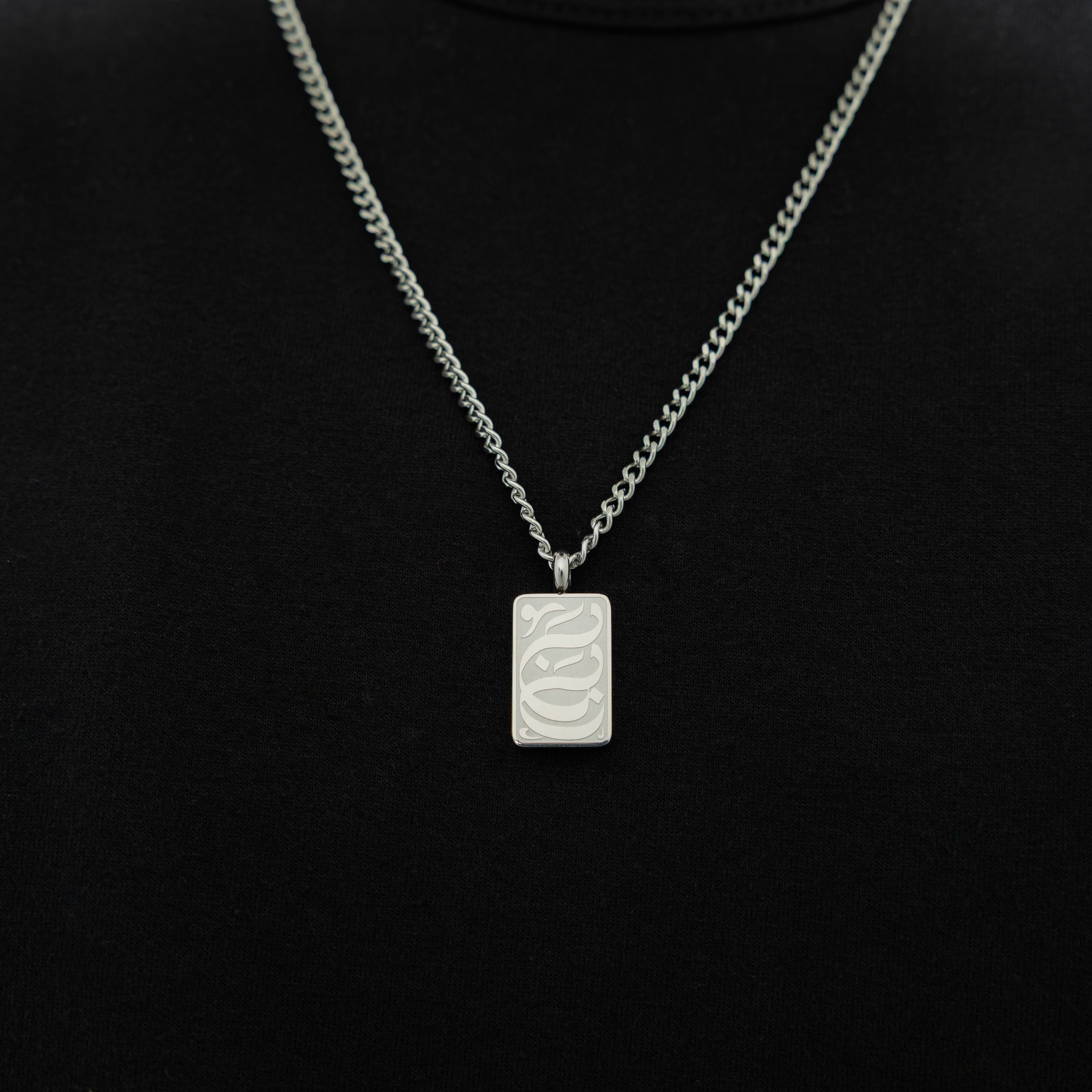 Silver Alhamdulillah token necklace worn on a beige textured shirt.Silver necklace with a circular pendant engraved with 'Alhamdulillah' calligraphy, displayed on a white background.