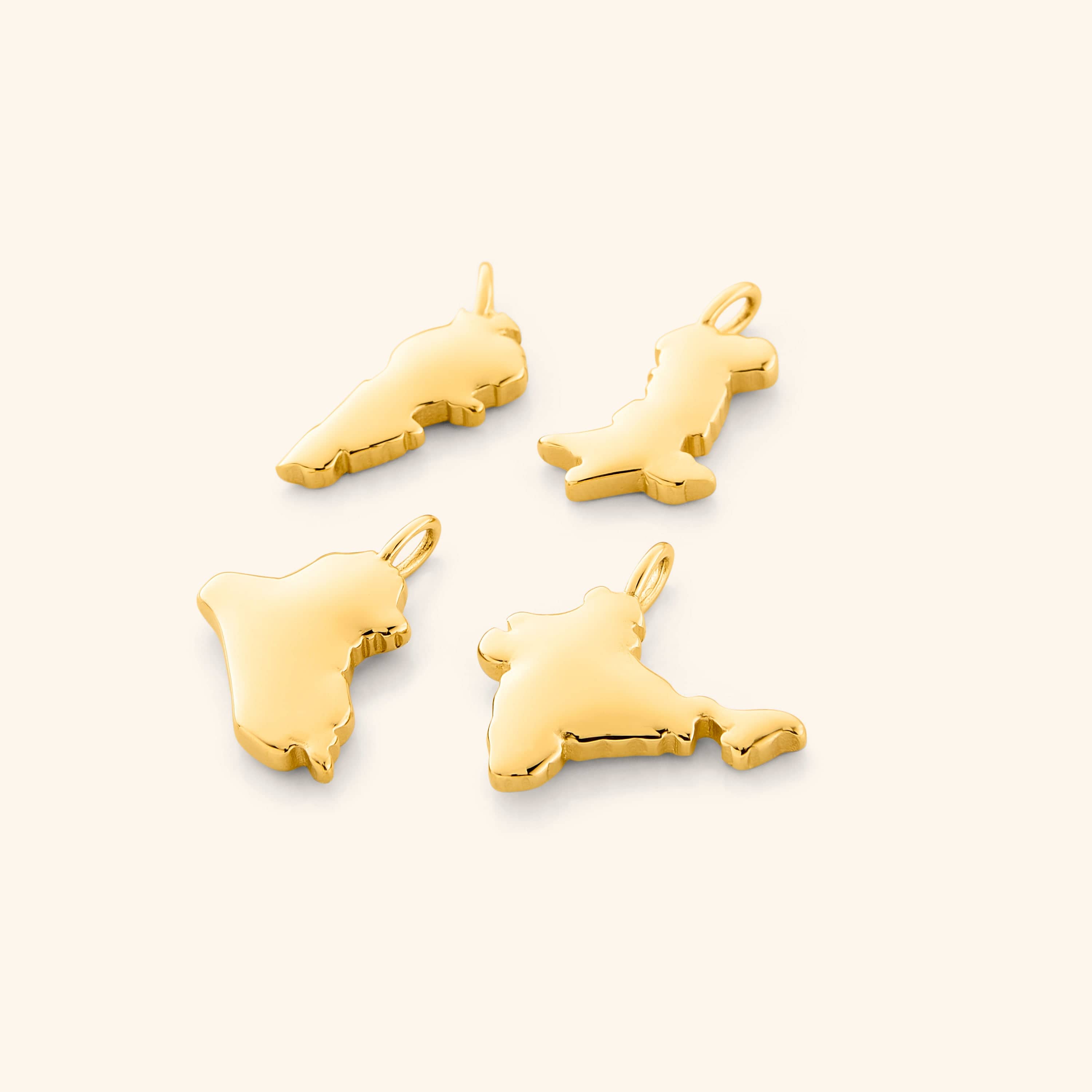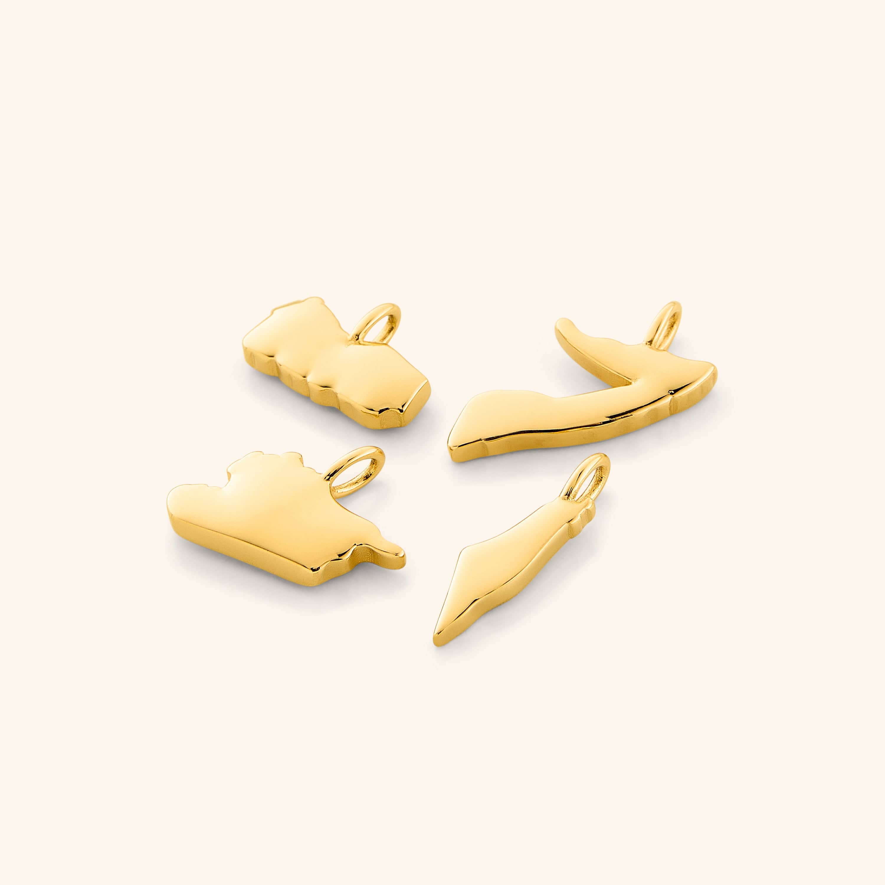 A model wearing the 18K gold-plated "With Hardship Comes Ease" Map Necklace. The necklace rests gracefully on her collarbone, highlighting the map pendant with Arabic calligraphy against a neutral-toned outfit.Four gold "With Hardship Comes Ease" Map Necklaces displayed side by side on a white background, each featuring a unique map-shaped pendant engraved with Arabic calligraphy, highlighting variations in map designs and delicate gold chains.