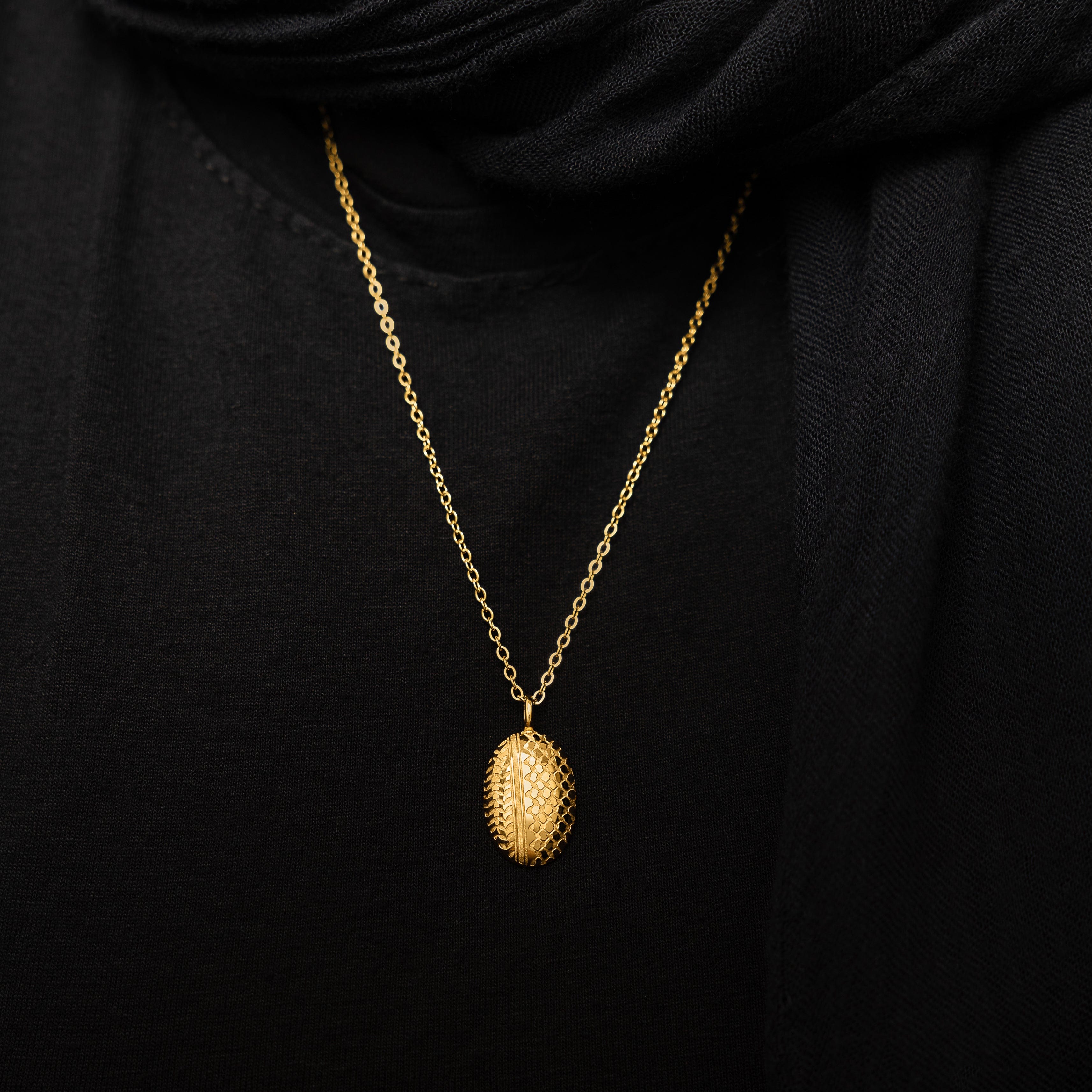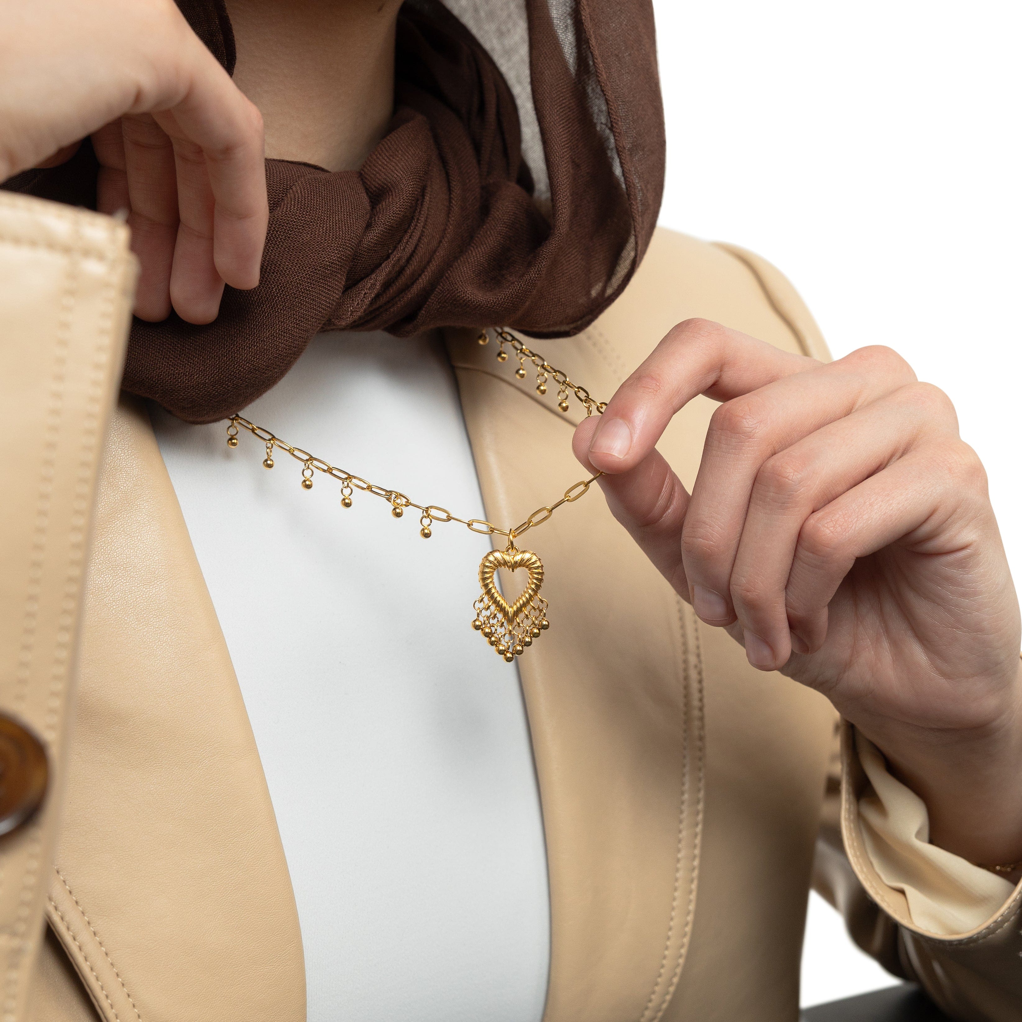 Gold Handala Necklace worn by a woman wearing a brown hijab and white shirtGold Handala Necklace on a white background