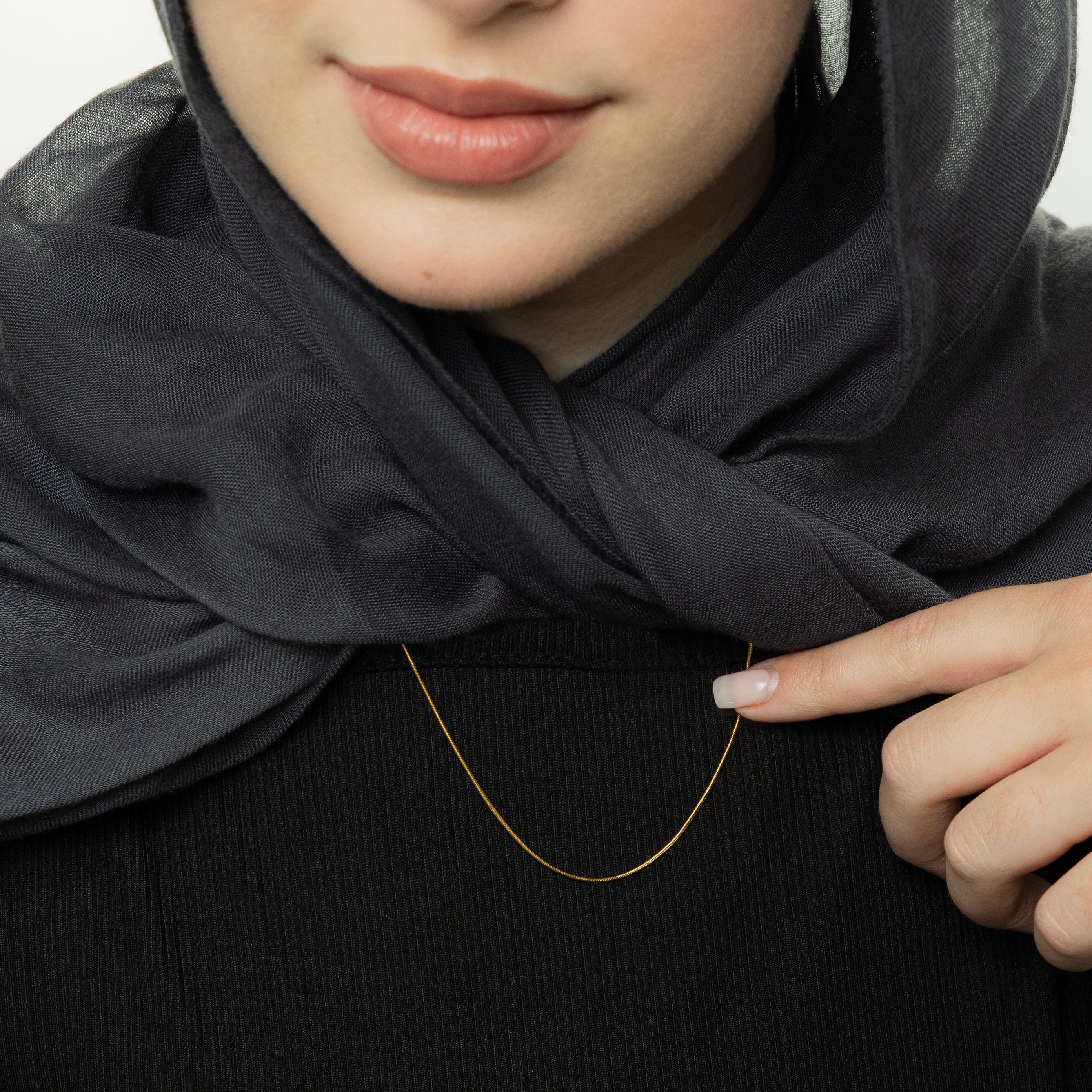 Woman wearing a keffiyeh patterned scarf and gold Al-Aqsa ‘Free Palestine’ Necklace on a white backgroundGold Al-Aqsa ‘Free Palestine’ Necklace with neaded chain on a white background