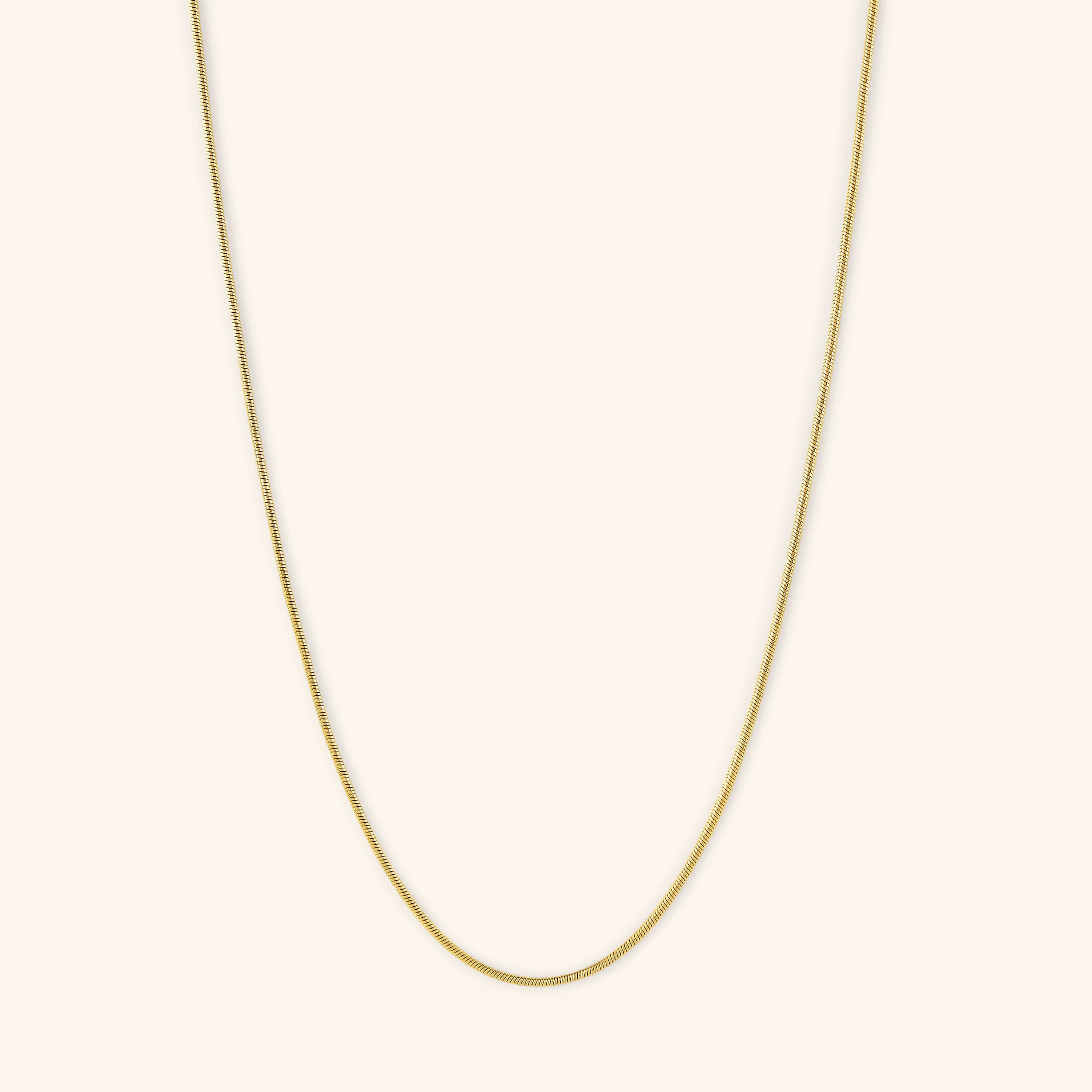 Gold Sakinah serenity ring styled with a gold twisted hand chain, worn on the ring finger, paired with a gold necklace.Gold ring with engraved “Sakinah” in Arabic calligraphy and lined side detailing. Inner of the band stamped with “NOMINAL.”
