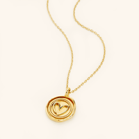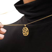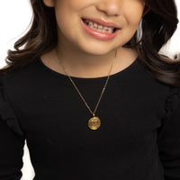 A model wearing the 18K gold-plated My Sister Oval Necklace. The pendant rests gracefully on her collarbone, highlighting the intricate Arabic calligraphy against a neutral-toned outfit.A close-up of the My Sister Oval Necklace in 18K gold plating. The oval pendant features the Arabic word "أختي" ("Ukhti" – My Sister) engraved in elegant calligraphy, suspended from a delicate gold curb chain.