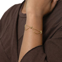 A close-up of the gold-plated Charm Keeper Necklace held in a model's hands, highlighting the carabiner clasp and attached charms.A close-up of a gold-plated Charm Keeper Necklace featuring a sleek carabiner clasp, with a rectangular charm and a square charm attached, resting on a model's open palm.