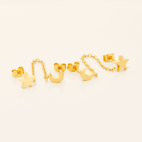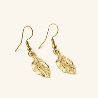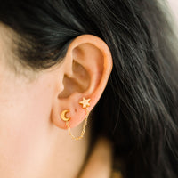 A female model with medium skin tone wearing the 18K gold-plated "Mama" stud earrings. The earrings sit delicately on her earlobes, complementing her minimalist outfit and highlighting the meaningful Arabic inscription.A close-up of the "Mama" stud earrings in 18K gold plating. Each earring features the Arabic letter "م" ("Meem"), and when worn together, they form the word "ماما" ("Mama"), symbolizing maternal love and strength. The gold finish adds a touch of warmth and elegance to the minimalist design.