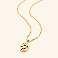 A model wearing the 18K gold-plated Mama Oval Necklace at its full 22-inch length. The necklace rests gracefully on the collarbone, highlighting the elegant Arabic calligraphy against a simple, neutral-toned outfit.A close-up of the Mama Oval Necklace in 18K gold plating. The pendant features the Arabic word "ماما" ("Mama") in elegant, swirling calligraphy, suspended from a 2mm wheat chain.