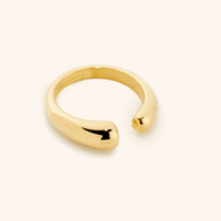 A model wearing the 18K gold-plated Arabic Mama Ring on her finger.A close-up of the Arabic Mama Ring in 18K gold plating. The ring features the Arabic word Mama in arabic calligraphy, with the Meem and Alif wrapping around to meet in the center, suspended from a gold band.