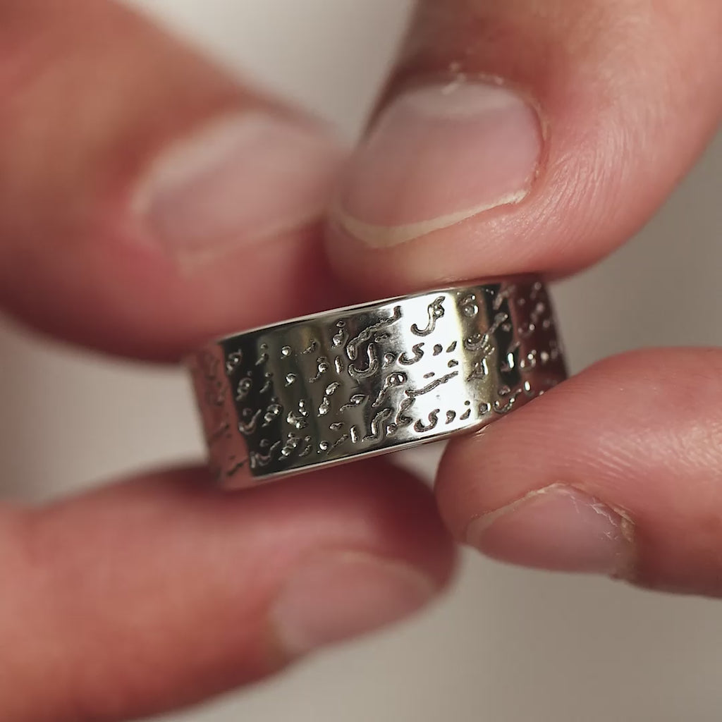 A wide ring split between two worlds: one side carved with Kalim Kashani's poem reminding you to find joy in the present moment between each wave, the other carved out of the metal with florals that feel alive. We left the metal open so the design breathes, balancing text and pattern without overwhelming either. For those who need the reminder to stay grounded in the now, to feel grateful for each moment before it passes.