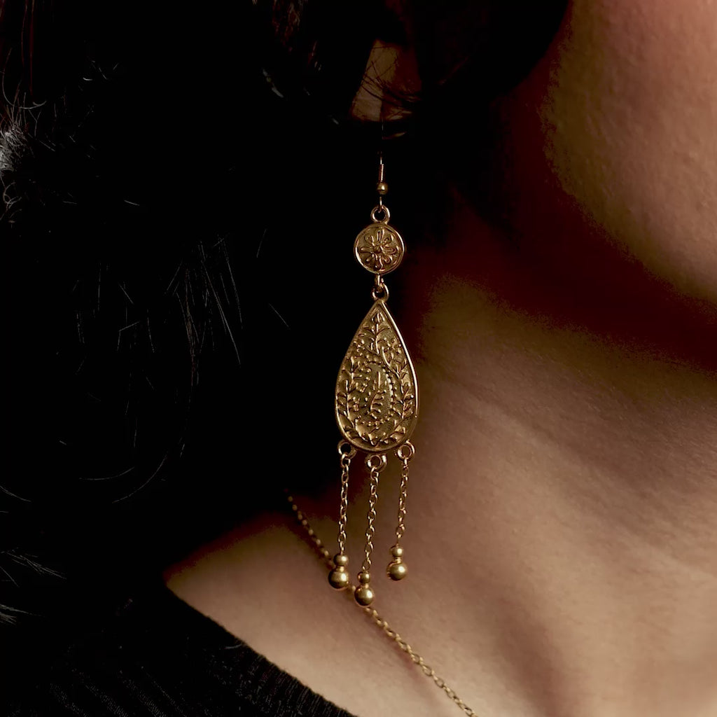 Paisley has always been more than a pattern. It’s one of the oldest symbols of South Asian art, carved into palaces, stamped on textiles, and worn across generations. These earrings take that familiar shape and give it movement, with three dangling drops that catch the light as you walk. Every detail is engraved and embossed, not printed, so it feels like a piece of heirloom jewelry rather than something temporary. Soft, intricate, and rooted in tradition. The kind of pair you keep for years.