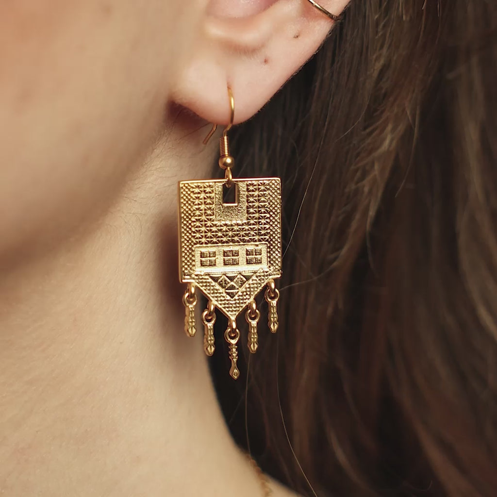 Statement earrings carved with motifs of tatreez, the traditional Palestinian embroidery passed down through generations. Each shape and line carries resilience and belonging which has been stitched into fabric for centuries, now etched into gold with chains trailing beneath like rain. For those who wear their heritage proudly, or for someone who wants to be reminded of where they come from.