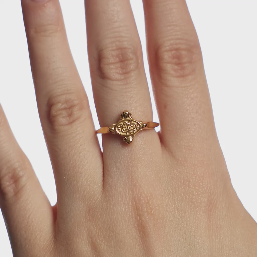 An intricate and minimal ring with a meaningful inscription sitting on the plate: "in our hearts" reminds us that all of our culture and the beautiful details that make us who we are sits deeply in our hearts.