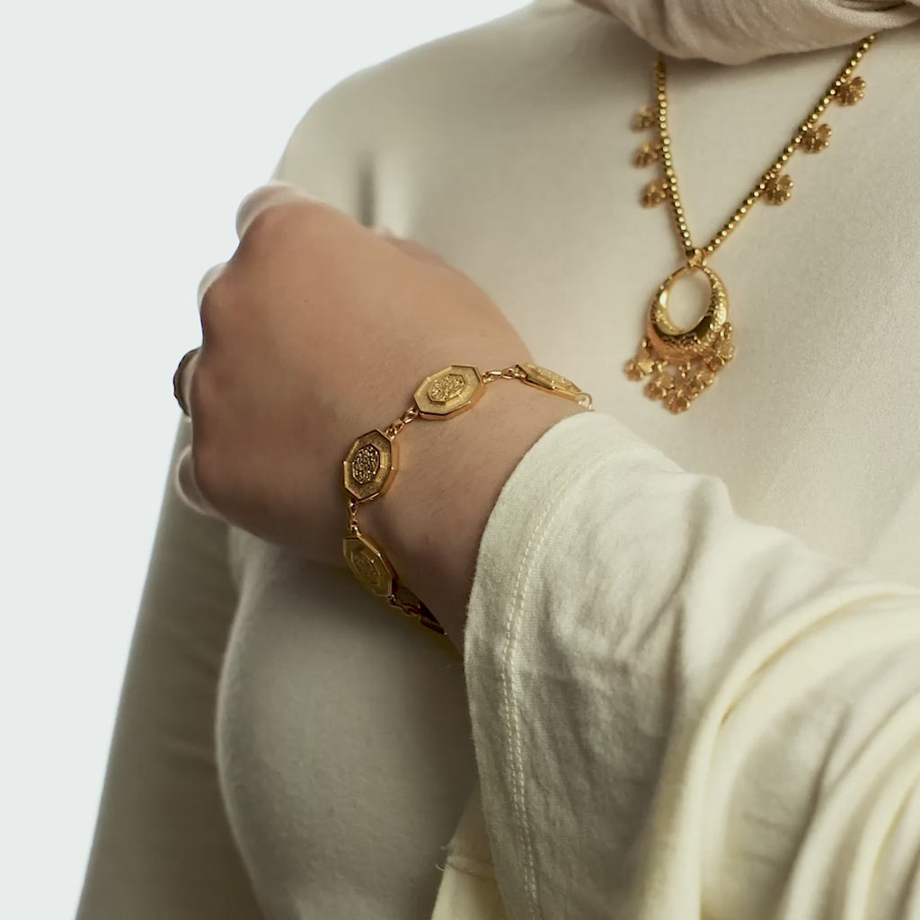 Inspired by traditional Damascene jewelry: hand-etched coins, floral borders, heirloom shapes saved for weddings and Eid, this bracelet brings that history into everyday wear. Each octagon is engraved with “our roots run deep” in Arabic, surrounded by delicate floral detailing that feels like something passed down, not newly made. Hold it as a small reminder of where we come from and the pride we carry just by being true to ourselves.