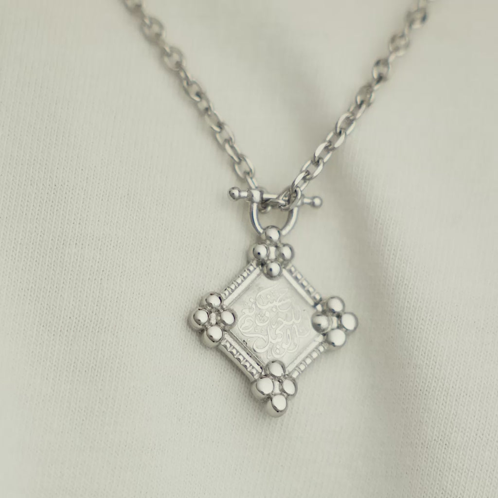 This pendant is adorned with orbs at each corner of the diamond-shaped pendant, hung through a traditional necklace loop giving this a timeless and modern edge.