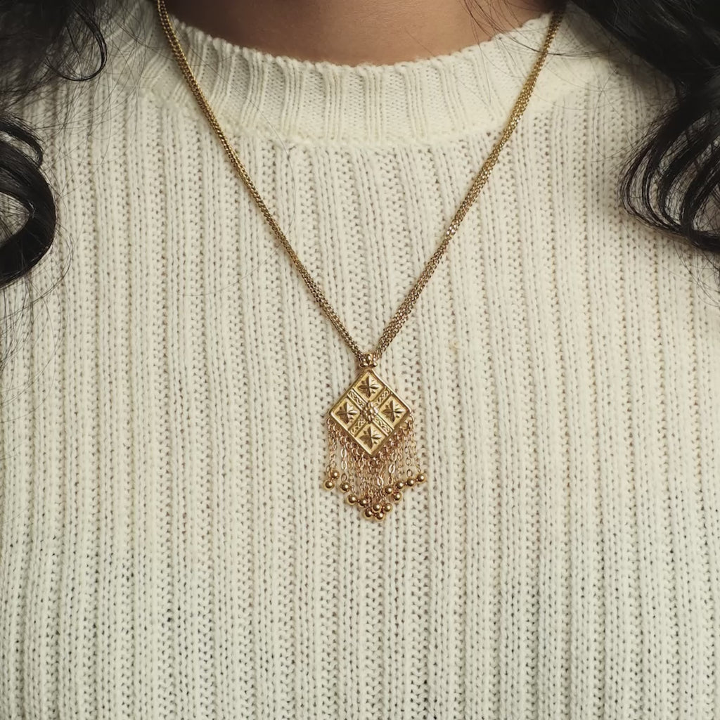 The Dancing Kite Necklace is an ode to the skies of Afghanistan where kites aren’t only for flying, they’re for chasing and celebrating. A double-Cuban chain leads to a floral-etched kite pendant which we've finished with streaming golden orbs that move softly with you to add motion to the kite. This piece carries a needed sense of play and freedom that connect you to home, no matter where you are.