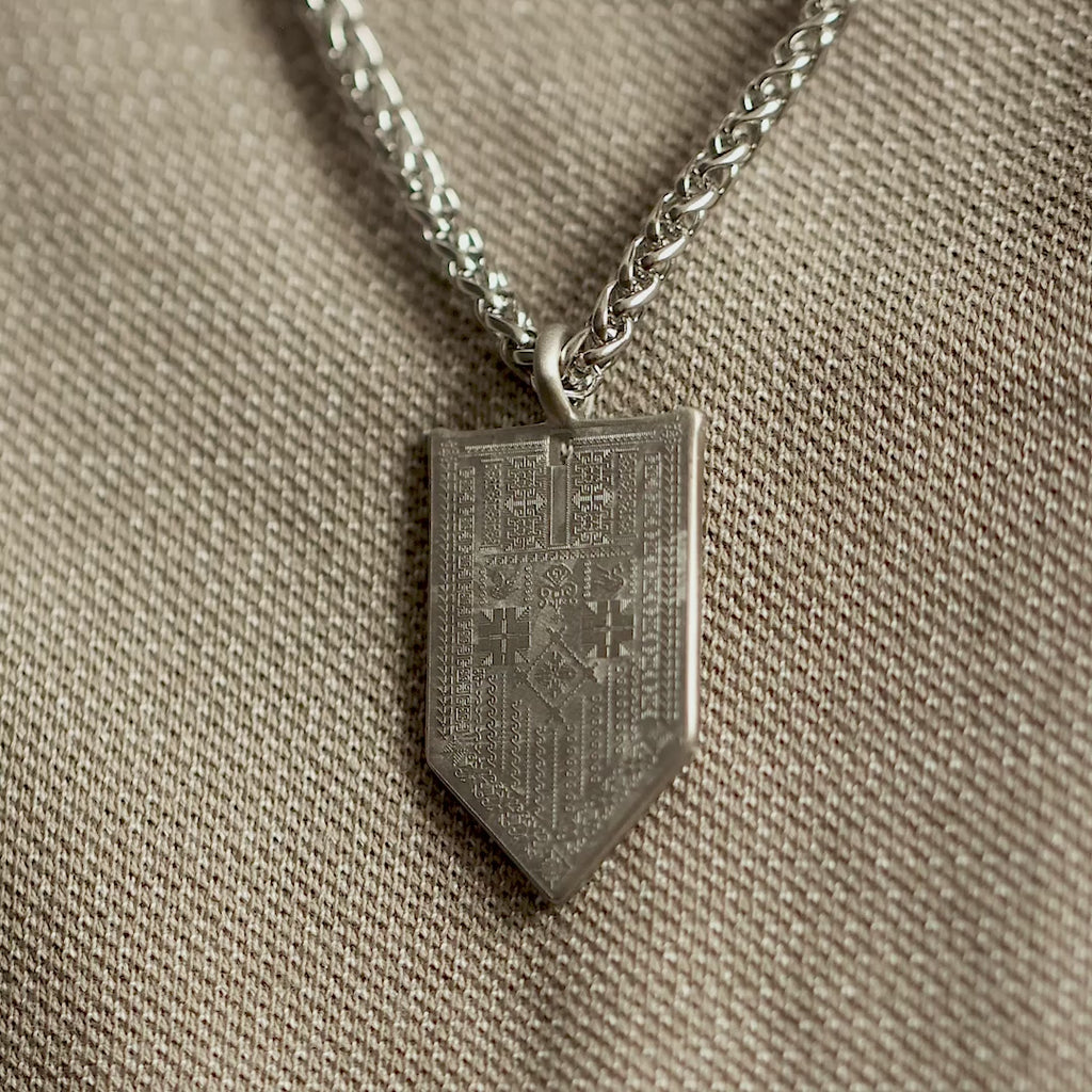 A statement piece rooted in heritage. This hanging pendant is etched with traditional tatreez motifs, patterns stitched to tell stories of land, lineage, and identity. Geometric stars, olive-branch inspired shapes, and classic cross-stitch engravings bring Palestinian embroidery to a modern, masculine form. We carry our culture proudly.
