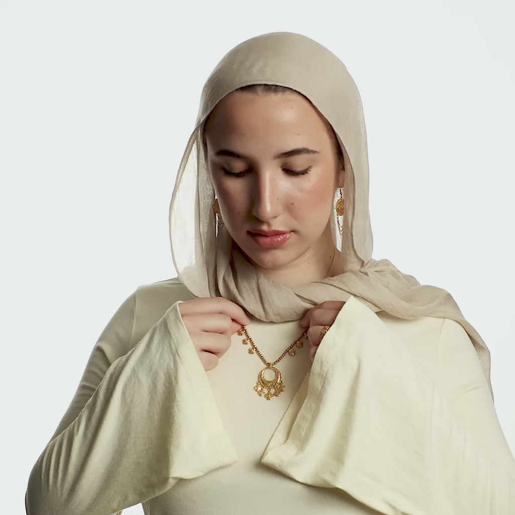 A masterpiece of nostalgia and details. The Levantine Garden Necklace feels like opening a jewelry box from grandma's dresser. The chain is lined with gold beads and tiny floral charms, leading into a crescent-shaped pendant covered in carved blooms and finished with dancing floral drops. Every inch is detailed, layered, and thoughtfully made, a necklace that looks and feels like it carries your story.